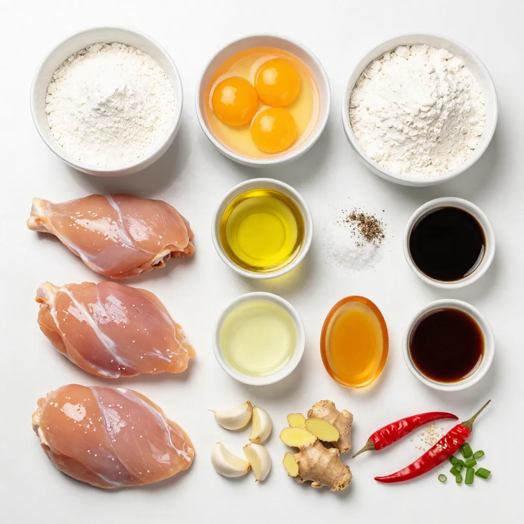 You need chicken thighs for the best flavor. They stay juicy while cooking. For the coating, mix cornstarch, all-purpose flour, baking soda, salt, and black pepper. This mixture gives the chicken a crispy texture. The egg wash helps the coating stick well.