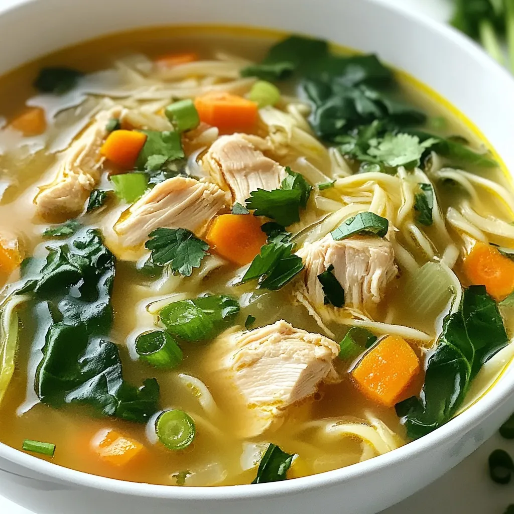 Now it’s time for the noodles! Add 4 ounces of rice noodles or egg noodles and 1 julienned carrot to the pot. Cook these for an additional 5 minutes until the noodles are tender. Stir in 2 cups of fresh spinach, 1 tablespoon of soy sauce, and 1 tablespoon of sesame oil. Season with salt and pepper to taste. Let this simmer for another 2 to 3 minutes until the spinach wilts. Serve the soup hot, topped with sliced green onions and fresh cilantro for a bright finish. Enjoy this heartwarming bowl of goodness!