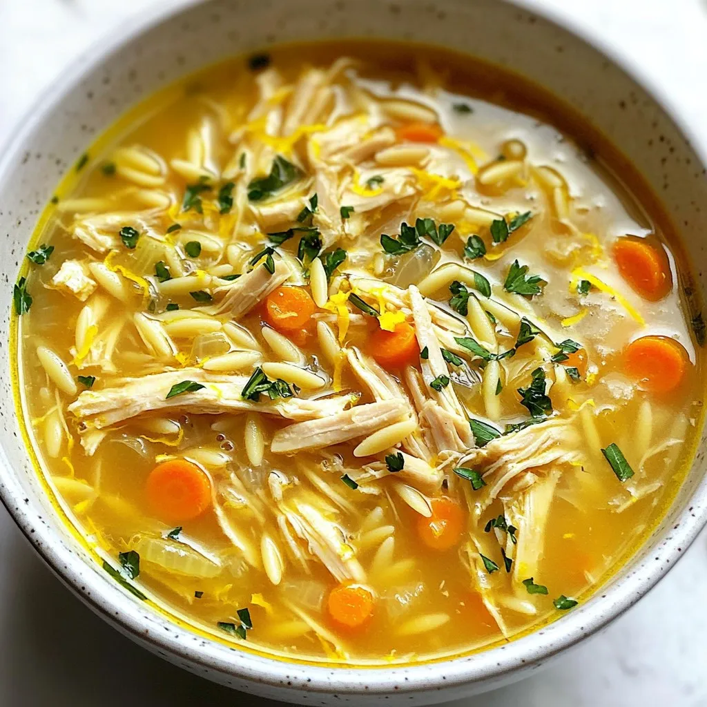 Each ingredient plays a key role in creating the soup’s unique flavor. The chicken gives the broth a rich base. The broth adds warmth and depth. Orzo pasta gives it a comforting texture. Carrots and onions provide sweetness and crunch. Garlic brings a lovely aroma. Eggs thicken the soup and add creaminess. Lemon juice and zest add a bright, fresh touch. Oregano enhances the soup’s Mediterranean flavor. Salt and pepper balance the dish. Lastly, parsley adds a pop of color and freshness.