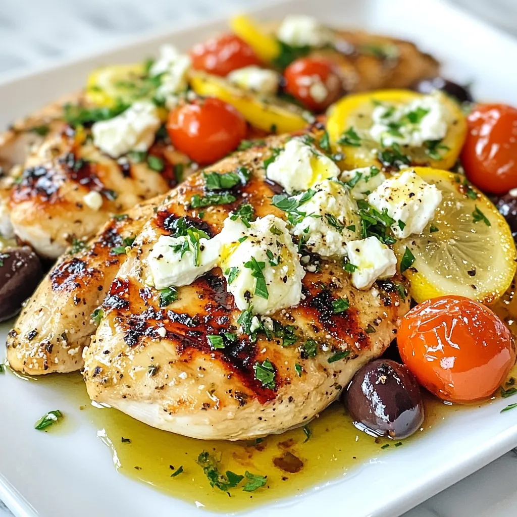 A flavorful grilled chicken dish marinated in lemon, garlic, and herbs, topped with feta cheese, cherry tomatoes, and olives.