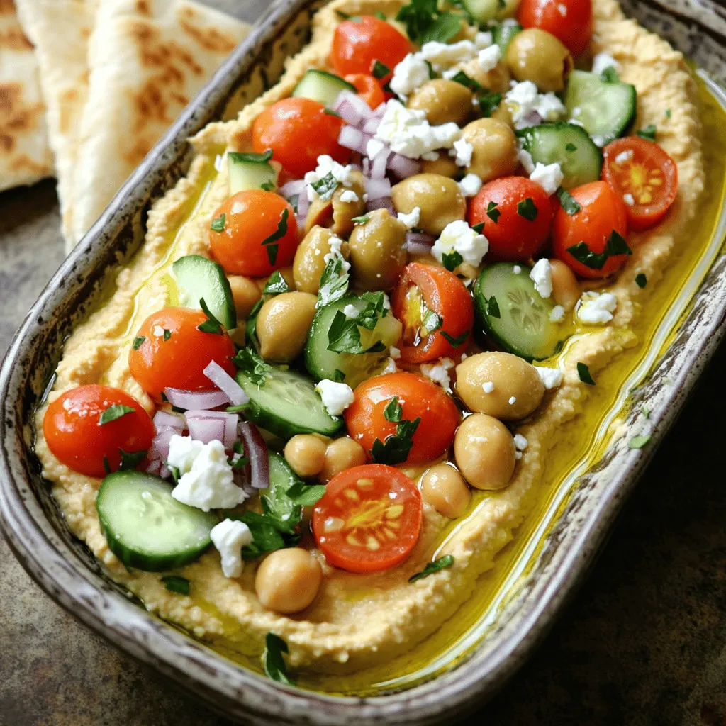 ![To make Greek loaded hummus, you need some key ingredients. These form the base and flavor of your dish: - 1 can (15 oz) chickpeas, drained and rinsed - 1/4 cup tahini - 2 tablespoons lemon juice - 2 cloves garlic, minced - 1/4 cup olive oil - 1 teaspoon ground cumin - Salt to taste These ingredients create a smooth, creamy hummus that is both tasty and healthy. Chickpeas give it protein and fiber. Tahini adds a nutty flavor, while lemon juice and garlic bring brightness. Olive oil makes it rich and smooth. Next, let’s talk about the fun toppings. These add color and crunch: - 1/2 cup cherry tomatoes, halved - 1/2 cucumber, diced - 1/4 red onion, finely chopped - 1/2 cup Kalamata olives, pitted and sliced - 1/2 cup feta cheese, crumbled - Fresh parsley, for garnish These toppings not only look good but also enhance the taste. Tomatoes add juiciness, while cucumbers give a refreshing crunch. Red onion provides a bit of bite, and olives add saltiness. Feta cheese brings creaminess and tang. Finally, don’t forget the spices and seasonings. These are key to adding depth to your hummus: - 1 teaspoon ground cumin - Salt to taste Cumin gives a warm, earthy flavor. Salt is vital for bringing all the tastes together. For the full recipe, check out the detailed steps. Enjoy making this Greek loaded hummus that is both flavorful and healthy! To make Greek loaded hummus, follow these easy steps. First, gather all your ingredients. You will need a food processor for this recipe. 1. Combine Ingredients: Start by adding the chickpeas, tahini, lemon juice, minced garlic, olive oil, ground cumin, and salt into the food processor. 2. Blend Until Smooth: Blend the mix for about one minute. You want it creamy and smooth. 3. Adjust Consistency: If your hummus feels thick, add a bit of water or extra olive oil to thin it out. Blend again until you reach your desired texture. Next, it's time to layer the toppings. 4. Transfer the Hummus: Carefully move the hummus to a shallow serving dish. 5. Create a Well: Use the back of a spoon to make a well in the center. This is where your toppings will go. 6. Layer Toppings: Start with the cherry tomatoes, then add the diced cucumber, red onion, and Kalamata olives into the well. Now, finish your masterpiece. 7. Add Feta: Evenly sprinkle crumbled feta on top of the hummus and toppings. 8. Drizzle Olive Oil: Pour a little olive oil over the whole dish. This adds flavor and makes it look nice. 9. Garnish: Finally, add some fresh parsley for a splash of color. Serve your Greek loaded hummus with warm pita bread or fresh veggies. Enjoy! For the full recipe, see the section above. To make your Greek loaded hummus even tastier, try adding spices. A pinch of smoked paprika gives a nice smoky flavor. You could also use a dash of cayenne for heat. Both will make your dish pop. If your hummus is too thick, don’t worry! Add a bit of water or more olive oil. Blend well until you reach a smooth and creamy texture. Adjust to your liking. When it comes to serving, presentation is key. Use a shallow dish for a beautiful look. Create a well in the center. This allows for a colorful display of toppings. Layer your cherry tomatoes, cucumber, onion, and olives neatly. Finish with crumbled feta on top. A drizzle of olive oil adds shine. For even more flair, garnish with fresh parsley. You can also serve it with warm pita bread. This adds a delightful touch for dipping. For the full recipe, check out the [Full Recipe]. {{image_2}} You can make Greek loaded hummus even more fun! Try adding roasted red peppers or artichokes for a smoky, sweet flavor. These add-ins bring a new taste and texture. You can also switch up the toppings. For a vegan option, leave out the feta cheese. Instead, use a sprinkle of nutritional yeast for a cheesy flavor. Serve the hummus with different sides. Instead of pita bread, use fresh veggie sticks, like carrots or bell peppers. You can even spoon it onto a salad for a healthy twist. The options are endless, and each variation makes it unique! For the full recipe, check out the [Full Recipe]. When you have extra Greek loaded hummus, store it properly to keep it fresh and tasty. Place the hummus in an airtight container. This helps seal in the flavor and maintain texture. Refrigerate it as soon as possible. For the best taste, use the hummus within three to five days. This keeps the ingredients fresh and safe to eat. If you notice any strange smells or colors, it is time to toss it out. To refresh stored hummus before serving, stir it well. If it seems dry, add a splash of olive oil or a bit of water. This helps bring back the creamy texture. You can also mix in fresh toppings like diced cucumbers or tomatoes. This adds a burst of flavor and color. For more details on making this dish, check the Full Recipe. What can I use instead of tahini? You can use sunflower seed butter or Greek yogurt. Both add creaminess. If you want a nut-free option, try using olive oil. Each choice gives a nice flavor. Can I prepare Greek loaded hummus in advance? Yes, you can make it a day ahead. Store it in the fridge in an airtight container. Just add the toppings right before serving for the best taste and texture. How do I make hummus without a food processor? You can mash chickpeas with a fork or potato masher. Mix in other ingredients by hand. It may take longer, but you can still enjoy tasty hummus. Is Greek loaded hummus gluten-free? Yes, Greek loaded hummus is gluten-free. Just be sure to serve it with gluten-free pita or veggies. This way, everyone can enjoy it safely. For the full recipe, check out the Greek Loaded Hummus section. In this post, I covered how to make Greek loaded hummus. We talked about key ingredients like chickpeas, tahini, and spices. I provided step-by-step instructions to make it easy for you. You learned tips to enhance flavor and serve it creatively. Lastly, I shared storage tips to keep it fresh. Greek loaded hummus is versatile and tasty. Now, yo