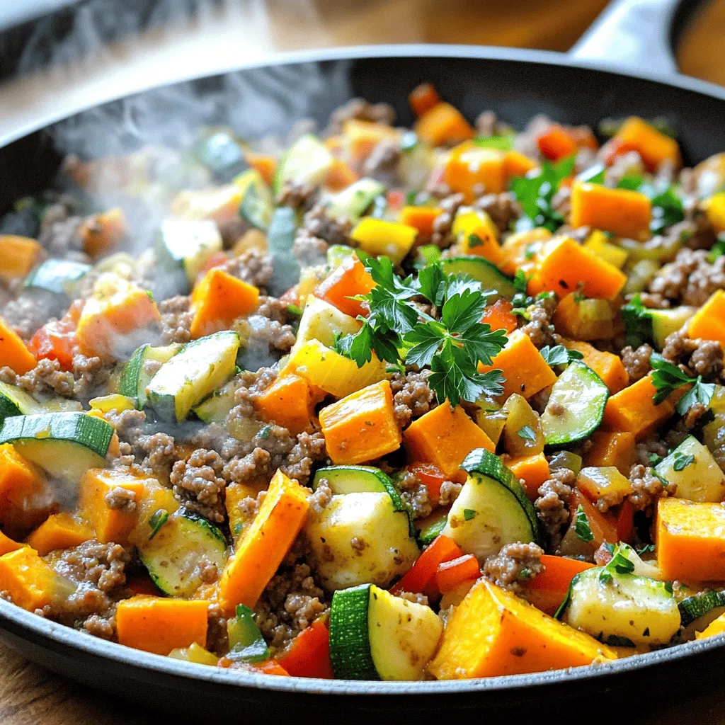 - 1 pound ground beef (lean) - 2 medium zucchini, diced - 1 medium sweet potato, peeled and diced - 1 bell pepper (any color), diced - 1 small onion, chopped - 3 cloves garlic, minced - 1 teaspoon ground cumin - 1 teaspoon smoked paprika - 1/2 teaspoon chili powder - Salt and pepper to taste - 2 tablespoons olive oil This dish shines due to its vibrant mix of flavors and colors. The ground beef provides a hearty base. Zucchini adds freshness, and sweet potato brings a touch of sweetness. Together, they create a balanced meal. Using fresh vegetables makes a big difference in taste. I love how bell pepper and onion add a sweet and savory note. Garlic gives it a lovely aroma. Each ingredient plays a key role in making this skillet dish special. The spices elevate the flavor profile. Ground cumin adds warmth, while smoked paprika gives a hint of smokiness. Chili powder can add a kick if you like it spicy. Adjust the seasonings to match your taste. For a full guide on making this dish, check out the [Full Recipe]. This meal is not just easy to make, but it also packs great nutrition. Enjoy crafting this delightful skillet! Start by washing your veggies. Chop the zucchini into half-moons. Cut the sweet potato into small cubes. Dice the bell pepper into bite-sized pieces. Next, mince the garlic cloves. Finally, chop the onion finely. This prep work makes cooking easier. Heat the olive oil in a large skillet over medium heat. Add the chopped onion and sauté for about 3 to 4 minutes. The onion should turn soft and translucent. Then, throw in the minced garlic. Cook for one more minute until it smells great. Now it’s time for the ground beef. Add it to the skillet, breaking it up with a spoon. Cook until the beef turns brown, about 5 to 7 minutes. If there's too much fat, drain it off carefully. Next, add the diced sweet potato to the skillet. Pour in one tablespoon of water and cover the pan. Let it cook for about 10 minutes. Stir it often until the sweet potatoes are tender. Once they're soft, mix in the zucchini and bell pepper. Now, sprinkle the cumin, smoked paprika, chili powder, salt, and pepper over the top. Stir everything well, then let it cook for another 5 to 7 minutes. This helps the flavors combine nicely. For the full recipe, check out the instructions above. Enjoy your cooking! - Best practices for sautéing: Always heat your skillet first. Add olive oil and let it warm. This helps your onions and garlic cook evenly. Stir them often to avoid burning. - How to achieve perfect browning: Cook the ground beef in a single layer. Don't overcrowd the pan. This allows all sides to brown nicely. Make sure to break it up as it cooks. - Suggestions for herbs and spices: Fresh herbs like parsley or cilantro add nice flavor. You can also try thyme or oregano for a twist. - Tips on adjusting seasonings to taste: Start with the recipe’s spices, then taste as you cook. If you want more heat, add extra chili powder. If you prefer a savory taste, increase the cumin. - Modifying cook time for softer vegetables: If you like softer veggies, cook the sweet potatoes a bit longer. Add a few more minutes before adding zucchini and bell pepper. - Recommendations for meal texture preferences: For crunchier vegetables, reduce cooking time. Keep an eye on the skillet and check for your desired texture. For a full recipe, check out the Ground Beef Zucchini Sweet Potato Skillet. {{image_2}} You can change the ground beef if you want. Try ground turkey or chicken for a leaner option. If you prefer plant-based meat, use lentils or black beans. These swaps keep the dish tasty and healthy. You can also add other vegetables. Consider carrots, corn, or spinach for more color and flavor. These veggies mix well and add nutrients. Feel free to get creative with what you have on hand! To make this dish gluten-free, use gluten-free seasonings. Most spices are safe, but check the labels. For a dairy-free version, skip any cheese toppings. The flavors still shine through without dairy. If you're watching carbs, skip the sweet potato. You can use cauliflower instead. This makes the meal low-carb but still filling. You can cook this dish on the stovetop or in the oven. For oven-baking, preheat to 400°F. Combine all ingredients in a baking dish and cook for 25-30 minutes. This method gives a nice roasted flavor. For slow cooker fans, brown the beef and add everything to the slow cooker. Cook on low for 6-8 hours or high for 3-4 hours. This makes the meal easy and hands-off. Find the full recipe for more details! To keep your Ground Beef Zucchini Sweet Potato Skillet fresh, store leftovers properly. Place them in an airtight container. This helps prevent moisture loss and keeps the meal tasty. You can refrigerate them for up to four days. For longer storage, freeze the skillet dish. It stays good in the freezer for up to three months. Just make sure to cool it first before freezing. When reheating, use the stovetop for best results. Heat a skillet over medium-low heat. Add a splash of water or olive oil to keep it moist. Stir often until heated through. If you prefer the microwave, use a microwave-safe dish. Cover it with a damp paper towel. Heat in short bursts, stirring in between, until hot. This method keeps the flavors intact and prevents overcooking. Meal prep can save time and effort. Chop your veggies ahead of time. You can store them in separate containers. This makes cooking quick and easy on busy days. Consider browning the ground beef in advance too. Store it in the fridge or freezer. You can mix all components together right before serving. This keeps everything fresh and flavorful. This dish lasts about 3 to 4 days in the fridge. Store it in an airtight container. To ensure the best taste, eat it within this time. The flavors improve as it sits, making it a tasty leftover option. Yes, you can use frozen vegetables! They work well in this recipe. Just add them a bit later in the cooking process. This way, they