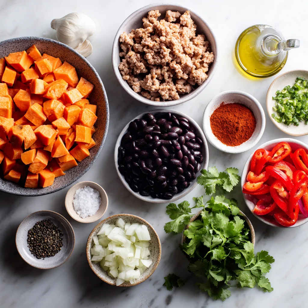 Peel and dice the sweet potatoes. Chop the onion and bell pepper. Mince the garlic. Rinse and drain the black beans. This prep makes cooking easier.