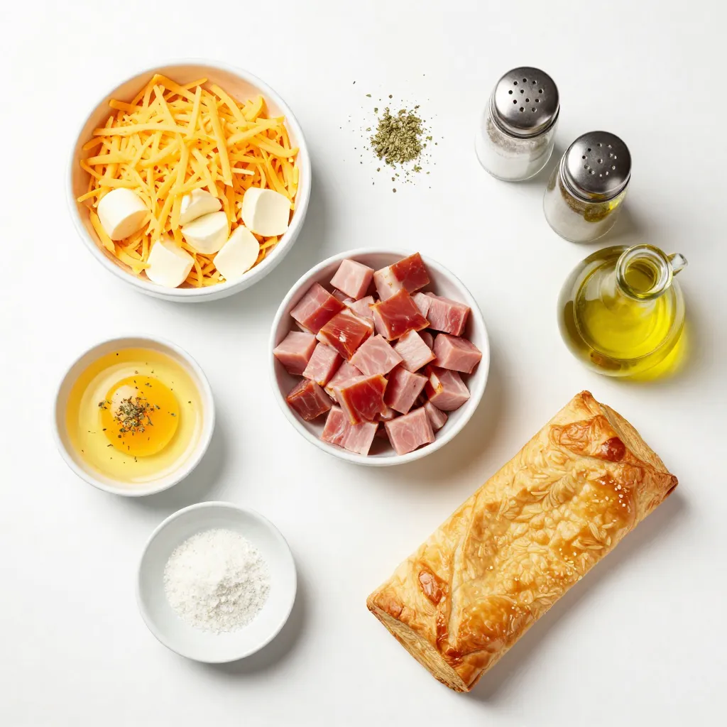 The main ingredients in these ham and cheese sticks create a tasty and fulfilling snack. I love using cheddar or mozzarella cheese. Each cheese offers a unique flavor. Diced cooked ham adds a savory touch. Puff pastry makes everything crisp and flaky.