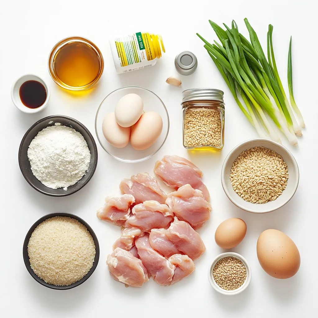 The main ingredients create a tasty and healthy sesame chicken. The chicken breasts give protein. Whole wheat flour adds fiber. Cornstarch helps with crunch.