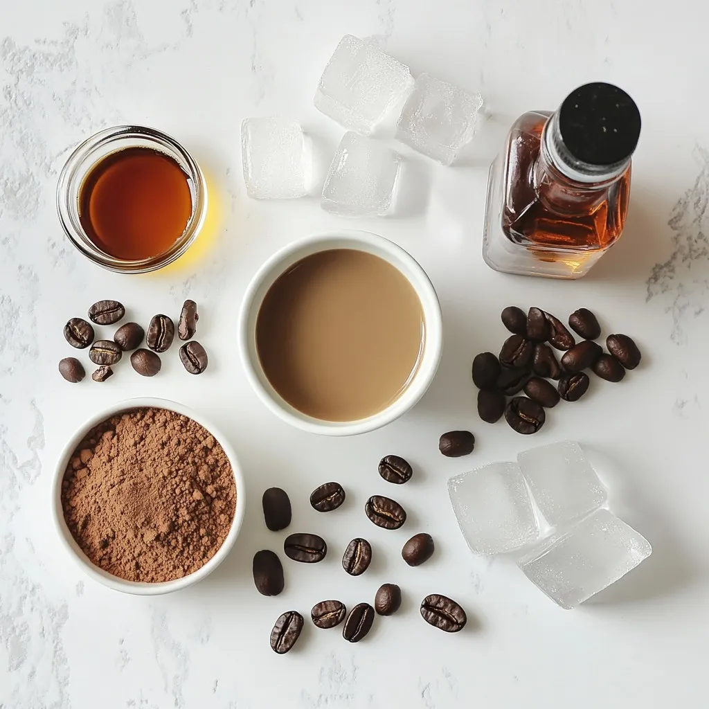 The main ingredient is strong brewed espresso. It gives the drink its rich flavor. Use fresh, high-quality beans for the best taste. Next, almond milk adds a creamy texture. You can use any non-dairy milk you like. Cocoa powder brings a hint of chocolate. It adds depth to the drink. Maple syrup sweetens it naturally. You can adjust the amount based on your taste. Vanilla extract adds warmth and aroma. Finally, we use coffee beans for garnish. They make the drink look elegant and festive. Don’t forget about ice cubes! They chill the drink perfectly.