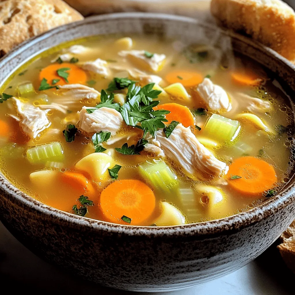 ![- 1 lb chicken breast, diced - 1 medium onion, chopped - 3 cloves garlic, minced - 3 medium carrots, sliced - 2 celery stalks, chopped - 8 cups low-sodium chicken broth - 2 cups egg noodles - 1 teaspoon dried thyme - 1 teaspoon dried rosemary - Salt and pepper to taste - 2 tablespoons olive oil - Fresh parsley, chopped, for garnish Chicken is the heart of this soup. It adds protein and richness. I prefer using chicken breast for a leaner option. Dicing it helps it cook faster and blend well with the other ingredients. Onions and garlic form the base of flavor. They create a fragrant aroma that fills your kitchen. Carrots and celery add sweetness and crunch. Together, they create a well-rounded taste and texture. - Broth options: You can use homemade or store-bought broth. Low-sodium broth is best for controlling salt. - Garnishes: Fresh parsley adds color and brightness. You might also try a sprinkle of black pepper. - Alternative noodles: Egg noodles are classic. Gluten-free pasta or whole grain noodles also work well. Choosing the right broth can elevate your soup. Homemade broth gives a rich flavor. However, quality store-bought options save time. For garnishes, fresh parsley makes a simple yet impactful addition. - Caloric breakdown: One serving has about 250 calories. - Key nutrients: This soup is rich in protein, vitamins, and fiber. - Dietary considerations: It can be adapted to fit gluten-free or low-sodium diets. Knowing the nutritional value helps you make informed choices. Chicken provides lean protein. The vegetables add vitamins and minerals. Plus, this soup is comforting without being heavy, making it a perfect meal for any day. First, gather all your ingredients. You need fresh chicken, veggies, and herbs. Here’s what to chop: - 1 lb chicken breast, diced - 1 medium onion, chopped - 3 cloves garlic, minced - 3 medium carrots, sliced - 2 celery stalks, chopped Chop your onion and garlic first. In a large pot, heat 2 tablespoons of olive oil over medium heat. Add the chopped onion and minced garlic. Sauté until the onion turns translucent, about 5 minutes. This helps bring out their flavor. Now, add the diced chicken to the pot. Cook it until it’s no longer pink, which should take about 5 to 7 minutes. Stir it occasionally so it cooks evenly. Then, toss in your sliced carrots and chopped celery. Cook these for another 3 to 4 minutes, allowing them to soften a bit. Next, pour in 8 cups of low-sodium chicken broth. Bring the mixture to a boil. Once boiling, reduce the heat. Add 2 cups of egg noodles, 1 teaspoon of dried thyme, and 1 teaspoon of dried rosemary. Simmer this for about 10 to 12 minutes, or until the noodles are tender. Stir occasionally to prevent sticking. After simmering, taste your soup. Adjust the seasonings by adding salt and pepper as needed. The last step is to remove the pot from heat. Stir in some chopped fresh parsley for a burst of color and flavor. Serve the soup in deep bowls, garnished with extra parsley and a sprinkle of black pepper. Enjoy your comforting bowl of homemade chicken noodle soup! For the full recipe, check [Full Recipe]. To make a perfect broth, start with quality chicken. Use low-sodium broth for a healthier option. Simmer gently to let flavors blend well. Avoid boiling too hard; it can make the broth cloudy. For the noodles, add them near the end of cooking. This keeps them from becoming mushy. Cook them just until they are tender. Remember, they will continue to cook a bit after you remove the pot from the heat. Fresh herbs can bring your soup to life. Consider adding parsley, thyme, or dill. These herbs add brightness and flavor. You can also spice things up! Try adding a pinch of cayenne or black pepper. A dash of paprika can also add depth to your broth. Soggy vegetables can ruin your soup. Add them at the right time. Cook them only until they are slightly tender. Maintaining broth clarity is key. Avoid stirring too much after adding the noodles. This helps keep everything looking nice and clear. For a full recipe, check out the Cozy Chicken Noodle Soup section. {{image_2}} You can make this soup vegetarian. Start by substituting chicken with tofu. Tofu adds protein and absorbs flavors well. Use firm tofu for the best texture. Next, use vegetable broth instead of chicken broth. This keeps the soup rich and tasty. You can also add more veggies, like bell peppers or peas, for extra flavor. If you prefer using a slow cooker, there are easy adjustments. Start by sautéing the onion and garlic in a pan first. This step adds depth to the soup. Then, combine all ingredients in the slow cooker. Set it to low for 6-8 hours. If you're in a hurry, you can set it to high for 3-4 hours. Just make sure to check the chicken for doneness. For a gluten-free soup, choose alternative noodle options. Rice noodles or gluten-free pasta work well. Make sure to cook them separately if needed. Also, ensure your broth is gluten-free. Some broths may contain gluten, so check labels. This way, everyone can enjoy a comforting bowl of soup. For the full recipe, you can refer to the Cozy Chicken Noodle Soup section. After enjoying your homemade chicken noodle soup, store any leftovers in the fridge. Place the soup in airtight containers. Glass or plastic containers work well. Make sure to cool the soup to room temperature before sealing. This helps prevent condensation and keeps the soup fresh. To freeze chicken noodle soup, use freezer-safe containers. Leave some space at the top for expansion. You can also use freezer bags. Just lay them flat for easy stacking. When ready to eat, thaw the soup in the fridge overnight. Reheat it on the stove or in the microwave until hot. Chicken noodle soup lasts about 3 to 4 days in the fridge. If frozen, it can last up to 3 months. Check for signs of spoilage before eating. If the soup smells off or looks discolored, it’s best to throw it away. Always trust your senses when it comes to food safety. Yes, you can us