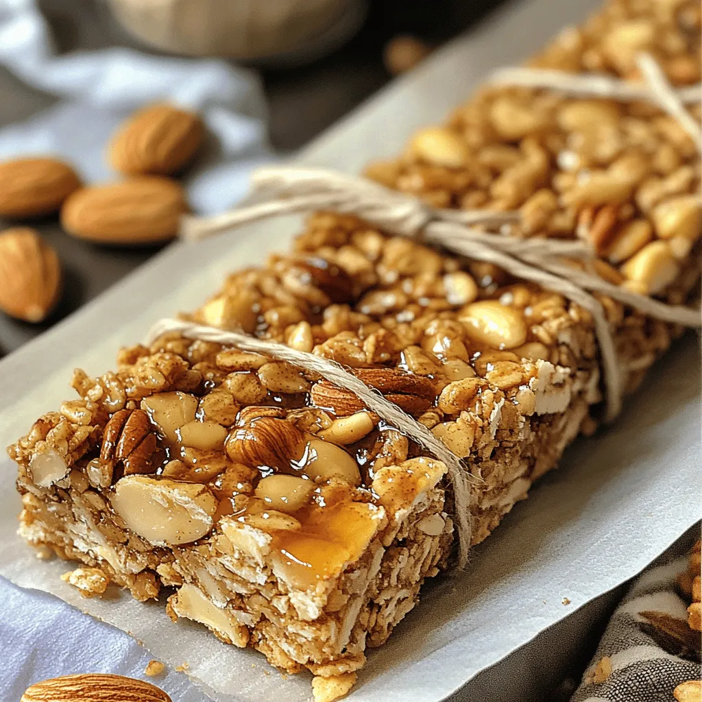To make my homemade granola bars, you need the following ingredients. Each one adds flavor and nutrition to your bars: - 2 cups rolled oats - 1 cup almonds, roughly chopped - 1/2 cup walnuts, roughly chopped - 1/2 cup sunflower seeds - 1/2 cup honey or maple syrup - 1/4 cup almond butter (or any nut butter of your choice) - 1/2 teaspoon vanilla extract - 1/2 teaspoon cinnamon - 1/4 teaspoon salt - 1/2 cup dried cranberries or raisins (optional) These ingredients make a perfect blend for a tasty snack. The oats give a nice base. Nuts add crunch and healthy fats. Sunflower seeds give you extra protein. Honey or maple syrup sweetens it all up. Almond butter binds the mix together and adds creaminess. Vanilla and cinnamon boost the flavor. Salt balances everything out. If you like, toss in some dried fruit for a sweet surprise. You can find the Full Recipe for step-by-step instructions to make these nutrient-packed bars. - Preheat the oven to 350°F (175°C). - Prepare an 8x8 inch (20x20 cm) baking pan by lining it with parchment paper. Leave some paper over the edges. This helps you lift the bars out later. - In a large bowl, combine 2 cups of rolled oats, 1 cup of roughly chopped almonds, 1/2 cup of roughly chopped walnuts, 1/2 cup of sunflower seeds, and 1/2 teaspoon of cinnamon. Mix well so all the dry ingredients blend. - In a small saucepan, melt 1/2 cup of honey (or maple syrup) and 1/4 cup of almond butter over low heat. Stir until smooth. Remove it from heat, then add 1/2 teaspoon of vanilla extract and 1/4 teaspoon of salt. - Pour the melted mixture over the dry ingredients. Stir until everything is coated well. - If you want to add sweetness, fold in 1/2 cup of dried cranberries or raisins now. This adds a nice chewy texture. - Transfer the mixture into your prepared pan. Press it down firmly to create an even layer. Use a spatula or your damp hands to pack it tightly. - Bake the bars for 20-25 minutes. Look for golden brown edges. This means they are done. - Let them cool completely in the pan. Use the parchment paper to lift them out. After they cool, cut them into bars or squares. You can find the full recipe details above to guide you through this fun cooking adventure! To ensure your granola bars hold together, use enough sticky ingredients. Honey or maple syrup works well. The nut butter also helps bind everything. Make sure to pack the mixture tightly in the pan. Use a spatula or your damp hands to press it down firmly. This step is key to keeping your bars intact. Want to spice things up? Try adding chocolate chips or coconut flakes. You can also mix in seeds like chia or flax for extra nutrition. Dried fruits like apricots or figs can add sweetness. Experiment with spices such as nutmeg or ginger for a unique twist. Serving granola bars can be fun and creative. Cut them into fun shapes with cookie cutters. Wrap them in colorful parchment paper for a nice touch. Tie them with twine for a rustic look. These bars make great snacks for school or work. Enjoy them anytime, anywhere! {{image_2}} You can easily make vegan granola bars. Just swap honey for maple syrup. Maple syrup adds a sweet touch without any animal products. You can also use plant-based nut butters. Almond butter or peanut butter work great here. This way, you keep the bars tasty and cruelty-free. If you need gluten-free bars, use certified gluten-free oats. This ensures no cross-contamination happens. For seeds and nuts, choose alternatives like pumpkin seeds or pecans. These options keep your bars crunchy and packed with flavor. Feel free to mix up the flavors! For a chocolate twist, add chocolate chips. Dark chocolate adds richness and pairs well with nuts. You can also try tropical fruit and nut combinations. Dried pineapple, coconut, and macadamia nuts create a sunny taste. These variations keep your granola bars fresh and exciting. You can find the full recipe [here](#). To keep your homemade granola bars fresh, store them in an airtight container. This helps prevent them from getting stale. You can use glass jars, plastic containers, or resealable bags. If you want to keep them extra fresh, place a piece of parchment paper between layers of bars. At room temperature, these bars last about one week. For longer storage, freeze them. Wrapped in plastic wrap or foil, they can last up to three months in the freezer. Just remember to thaw them at room temperature before enjoying. Check for signs of spoilage before eating. If the bars smell off or have a dry texture, it's time to toss them. Also, if you see mold or any weird spots, throw them away. Trust your senses; they are good guides for freshness. How to make granola bars without nut butter? You can use mashed bananas, applesauce, or tahini instead of nut butter. These options help bind the bars together like nut butter does. They also add moisture and flavor. Can I use different types of oats? Yes, you can use quick oats or steel-cut oats. Quick oats will make the bars softer. Steel-cut oats will give a chewier texture. Just note that cooking times may vary. What can I substitute for honey? Maple syrup or agave nectar works well as a honey substitute. Both add sweetness without changing the taste too much. You can also use brown rice syrup if you want a thicker texture. Are homemade granola bars healthier than store-bought? Yes, homemade bars often contain fewer added sugars and no preservatives. You can control the ingredients, making them healthier. Plus, you can add superfoods like seeds and dried fruit for extra nutrition. What is the calorie count for one bar? Each granola bar has about 150 calories. The exact count can change based on your ingredients and portion size. For a more precise number, consider the specific brands you use. Can I add protein powder? Absolutely! You can mix in protein powder to boost the protein content. Start with one scoop and adjust based on your taste. Just remember to increase the wet ingredients slightly to balance it 
