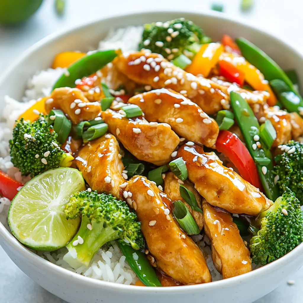 A delicious stir fry featuring tender chicken, vibrant vegetables, and a sweet and savory sauce.