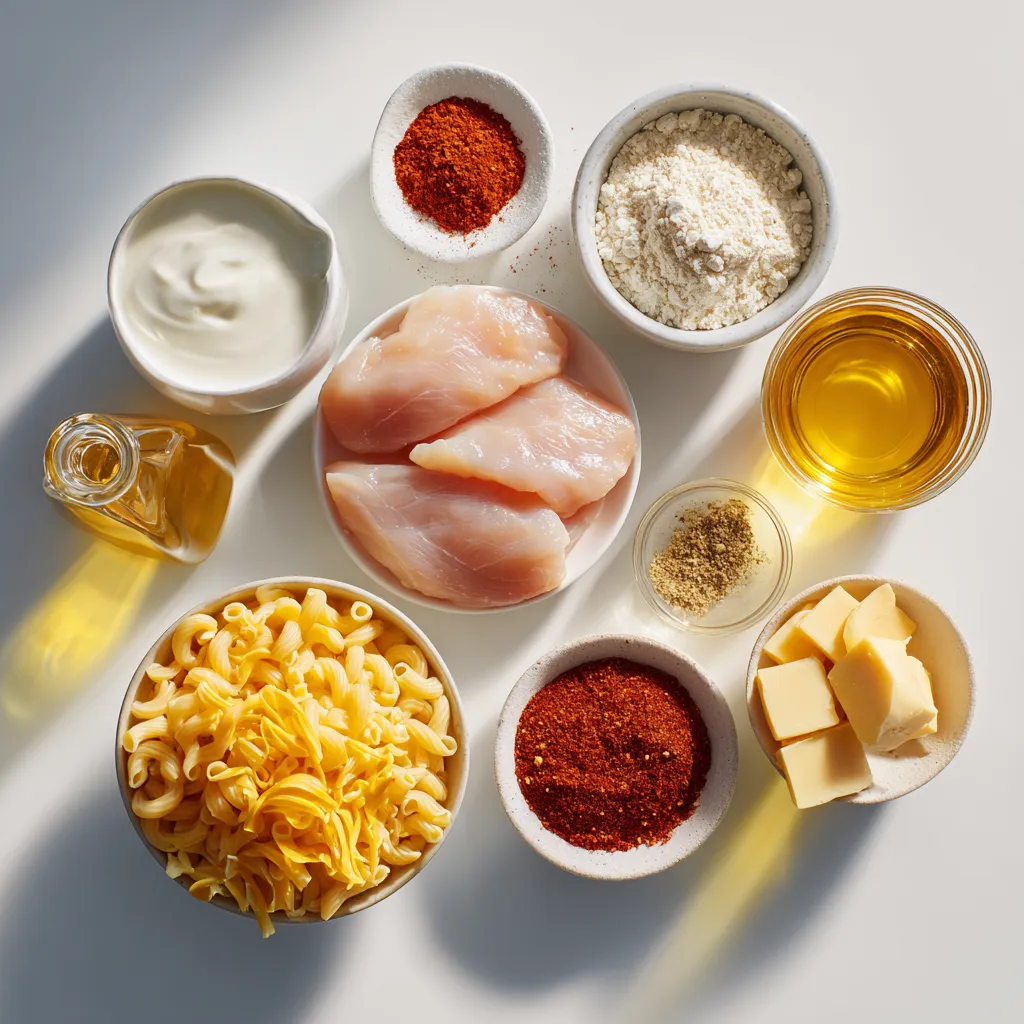 Gathering these ingredients will set you up for success. The chicken will be crispy, the mac and cheese creamy, and the hot honey will bring it all together with flavor. Enjoy the cooking process!