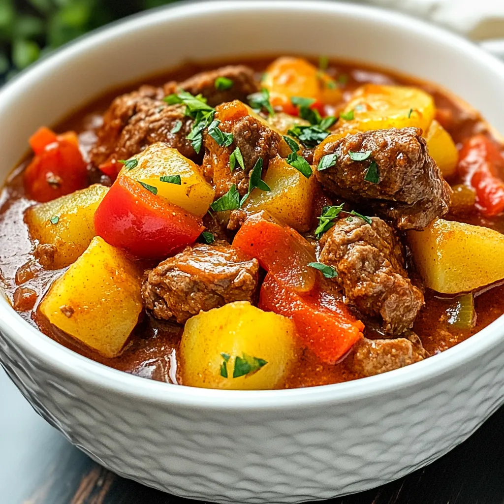 A hearty and flavorful stew made with beef, vegetables, and spices, perfect for warming up on a cold day.