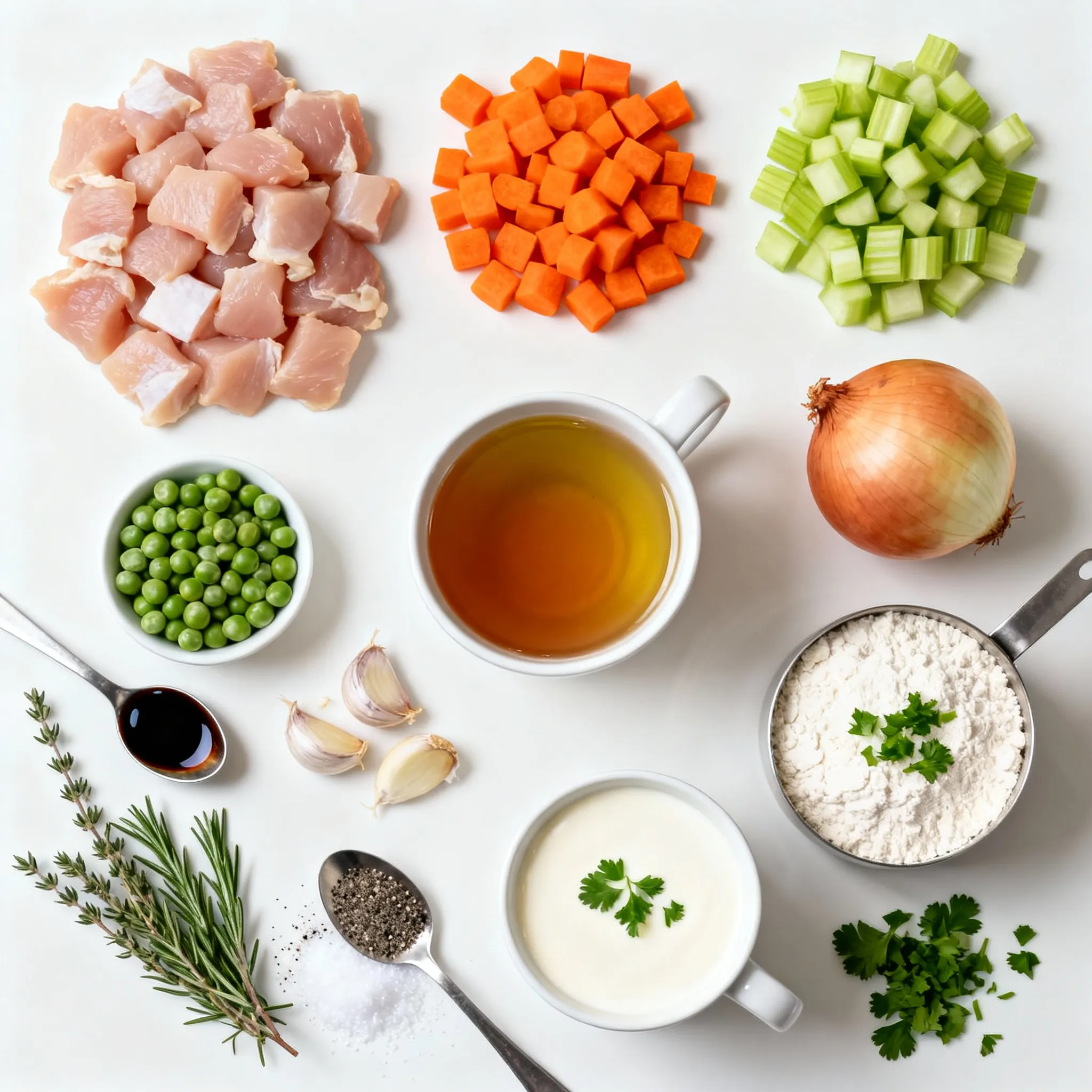 After the chicken is browned, it’s time to add more flavor. Add in 3 diced carrots, 2 diced celery stalks, and 1 cup of frozen peas. Then pour in 2 cups of chicken broth. Sprinkle in 1 teaspoon of dried thyme and 1 teaspoon of dried rosemary. If you like, add 1 tablespoon of Worcestershire sauce for extra taste. Stir all the ingredients to mix well.