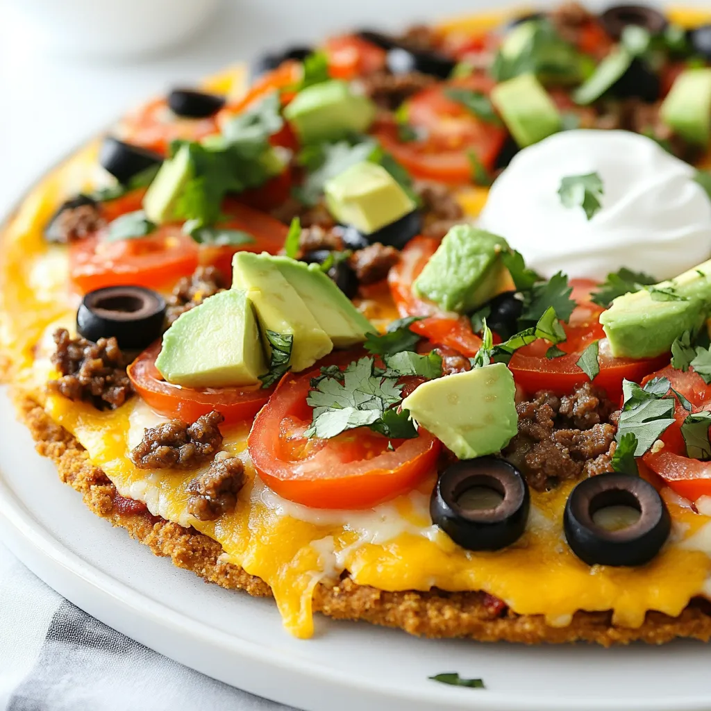 - 1 ½ cups almond flour - 1 cup shredded mozzarella cheese - 2 oz cream cheese, softened - 1 large egg - ½ teaspoon baking powder - 1 teaspoon taco seasoning - 1 cup cooked ground beef (seasoned with taco spices) - ½ cup diced tomatoes - ½ cup sliced black olives - 1 cup shredded cheddar cheese - 1 small avocado, diced - Fresh cilantro, for garnish - Sour cream, for serving (optional) If you seek alternatives for almond flour, use coconut flour. It also works well. For the cheese, swap mozzarella for provolone. It adds a unique taste. You can replace ground beef with shredded chicken for a lighter option. If you want a vegetarian twist, use mushrooms instead of meat. Each slice of Keto Mexican Pizza has about 4 grams of net carbs. It packs around 20 grams of protein. The total calorie count is about 250 per slice. This makes it a filling, low-carb meal. You can enjoy it without guilt! {{ingredient_image_1}} Start by preheating your oven to 400°F (200°C). This step is key for making a crispy crust. While the oven heats, grab a baking sheet. Line it with parchment paper. This keeps the crust from sticking. Plus, it makes cleanup easier. In a mixing bowl, combine these ingredients: - 1 ½ cups almond flour - 1 cup shredded mozzarella cheese - 2 oz cream cheese, softened - 1 large egg - ½ teaspoon baking powder - 1 teaspoon taco seasoning Mix these until you have a dough. It's okay if it feels a bit sticky. Next, transfer the dough to your lined baking sheet. Use your hands or a rolling pin to flatten it. Aim for about ¼ inch thick. This thickness gives the crust a nice bite. Now it’s time to bake! Place the crust in your preheated oven. Bake for 12-15 minutes. You want it to get golden brown. Once it’s ready, take it out and let it cool slightly. This cooling helps it hold up when you add toppings. To make the crust just right, use fresh ingredients. Almond flour gives a nice texture. Mix well until the dough forms. If it feels too sticky, add a little more almond flour. Shape it evenly. A ¼ inch thick crust bakes best. Watch it closely while baking. You want it golden brown. This helps create a strong base for your toppings. Garnishes can make your pizza shine. Diced avocado adds creaminess. Fresh cilantro gives a pop of flavor. You can also use sliced jalapeños for some heat. A sprinkle of lime juice brightens the taste. If you love dairy, add a dollop of sour cream. These simple touches make each bite exciting. Avoiding mistakes helps keep your pizza perfect. First, don’t rush the crust baking. If you take it out too soon, it may be soggy. Second, use enough taco seasoning. This adds great flavor to the ground beef. Lastly, don’t overload on toppings. Too many can make the pizza fall apart. Stick to a good balance for the best result. Pro Tips Use a Food Processor: For a quicker and more uniform dough, consider using a food processor to blend the ingredients for the crust. Customize Your Toppings: Feel free to swap or add toppings based on your preferences—jalapeños, bell peppers, or even different cheeses work great! Let It Cool: Allow the crust to cool slightly after baking before adding toppings to prevent them from sliding off. Make Ahead: You can prepare the crust in advance and store it in the fridge for up to 2 days before adding toppings and baking. {{image_2}} You can make a tasty vegetarian version of this pizza. Start with the same crust. Instead of meat, use a mix of colorful veggies. Bell peppers, onions, and zucchini work well. Add some black beans for protein. Top with your favorite cheese. This pizza is fresh and full of flavor. If you like heat, try spicy chorizo or chicken. Cook the chorizo until it's brown and crispy. For chicken, use seasoned cooked chicken breast. You can also add jalapeños for an extra kick. Both options will give your pizza a bold taste. Cheese adds creaminess and flavor. While I love cheddar and mozzarella, you can mix it up. Try pepper jack for spice or feta for a tangy twist. Cream cheese can also be great. It gives extra richness to every bite. Feel free to experiment and find your favorite cheese blend. To store your leftover Keto Mexican Pizza, let it cool first. Then, wrap each slice in plastic wrap or foil. Place the wrapped slices in an airtight container. Store them in the fridge for up to three days. Make sure to keep them away from strong smells in your fridge. To reheat your pizza, preheat your oven to 350°F (175°C). Place the slices on a baking sheet. Bake for about 10 minutes. This keeps the crust crispy. You can also use a microwave. Heat each slice for about 30 to 45 seconds. The oven method gives better texture. You can freeze Keto Mexican Pizza for later. Wrap each slice tightly in plastic wrap. Then, place the wrapped slices into a freezer bag. Label the bag with the date. Freeze for up to two months. When ready to eat, thaw in the fridge overnight. Reheat as mentioned above for best results. A Keto Mexican Pizza is a low-carb dish that combines pizza and Mexican flavors. It uses almond flour to make a crust. This crust is a great substitute for regular pizza dough. You top it with seasoned beef, cheese, and fresh toppings. It’s tasty and fits perfectly in a keto diet. Yes, you can make this pizza ahead of time. Prepare the crust and toppings, then store them separately. Keep them in the fridge for up to two days. When you are ready to eat, just assemble and bake it. This makes meal prep easy and fun. Each slice of Keto Mexican Pizza has about 5 grams of carbs. This is much lower than regular pizza. It’s a great option if you watch your carb intake. Plus, with all the flavors, you won't miss the extra carbs. No, almond flour is not the only option. You can use coconut flour too. Just remember, coconut flour absorbs more liquid. You might need to adjust the recipe a bit. Other low-carb flours are also available. Experiment with what you like best! This blog post covered the key steps to make a deliciou