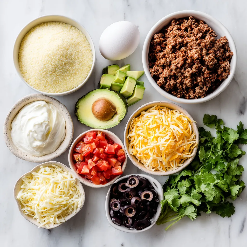 • In a mixing bowl, combine the almond flour, shredded mozzarella cheese, cream cheese, egg, baking powder, and taco seasoning. Mix well until a dough forms.