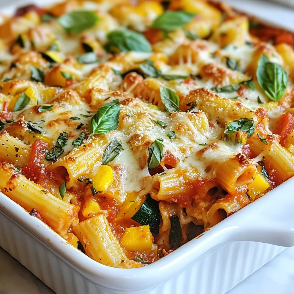A hearty and cheesy baked ziti dish loaded with vegetables.
