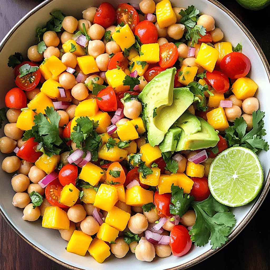 ![To make a delicious Mango Chickpea Salad, you need fresh and simple ingredients. Here is your list: - 1 ripe mango, diced - 1 can (15 oz) chickpeas, drained and rinsed - 1 red bell pepper, diced - ½ red onion, finely chopped - 1 cup cherry tomatoes, halved - 1 avocado, diced - ¼ cup fresh cilantro, chopped - 2 tablespoons olive oil - 1 tablespoon lime juice - 1 teaspoon ground cumin - Salt and pepper to taste Each ingredient adds flavor and texture. The mango gives sweetness, while chickpeas add protein. The red bell pepper and cherry tomatoes bring crunch and color. Avocado adds creaminess, making every bite delightful. You can customize your salad with extra ingredients. Here are some tasty options: - Cucumber for a refreshing crunch - Corn for sweetness and color - Feta cheese for a salty kick - Jalapeños for heat if you like spice Feel free to mix and match these add-ins. They can give your salad a unique twist and keep things exciting. This Mango Chickpea Salad is not only tasty but also healthy. Here’s what you get per serving: - Calories: Around 250 - Protein: About 10g - Fiber: 8g - Healthy fats from avocado and olive oil This salad provides a good balance of nutrients. It helps you feel full while being light and refreshing. It’s great for lunches or as a side dish at dinner. You can find the full recipe [here]. To start, gather all your ingredients. You will need a ripe mango, chickpeas, red bell pepper, cherry tomatoes, avocado, red onion, and cilantro. Dice the mango, avocado, and red bell pepper into small pieces. Place these in a large salad bowl. Next, drain and rinse the chickpeas. Add them to the bowl along with halved cherry tomatoes and finely chopped red onion. This mix gives the salad a fresh look and taste. Once your ingredients are prepared, it's time to combine them. Gently toss the mango, chickpeas, bell pepper, cherry tomatoes, avocado, red onion, and cilantro together in the bowl. Make sure everything is evenly mixed. The colors of the salad will pop, making it look inviting and delicious. This salad is not only tasty but also packed with nutrients. Now, let’s make the dressing. In a small bowl, whisk together olive oil, lime juice, ground cumin, salt, and pepper. This dressing adds a zesty flavor. Once mixed, drizzle it over the salad ingredients. Gently toss everything again to coat all the components well. Taste the salad and adjust the seasoning if needed. If you like a stronger flavor, add more salt, pepper, or lime juice. Chill the salad in the refrigerator for about 15 minutes. This waiting time helps the flavors blend beautifully. For the full recipe, check the details above. Chopping your ingredients well makes your salad look good. Here are some tips: - Use a sharp knife for clean cuts. - Cut the mango and avocado last to avoid browning. - Dice the red onion small so it blends well with other flavors. - Keep your cuts even for a nice look and feel. To make your salad pop, try these dressings: - Mix lime juice with honey for a sweet touch. - Add a dash of chili powder for heat. - Consider a splash of balsamic vinegar for richness. - Experiment with fresh herbs like basil or mint for a twist. Store your salad properly to keep it fresh: - Use an airtight container to lock in moisture. - Add the dressing just before serving to avoid sogginess. - Keep ingredients separate if you plan to store leftovers. - Refrigerate for up to two days for the best taste. For more details, check the Full Recipe for Mango Chickpea Delight. {{image_2}} You can keep this salad vegan easily. Swap the olive oil with avocado oil for a new taste. You can also use lemon juice instead of lime juice. If you like a creamy texture, add dairy-free yogurt. Try using hemp seeds for extra protein. They give a nice crunch, too. To make the salad more filling, add grains. Quinoa or brown rice works well. They add good texture and fiber. Cook the grains first, then mix them in. This will make the dish hearty and satisfying. You can serve it as a main meal or a side. If you love heat, add jalapeños. Dice them finely and mix them in with the other veggies. Start with a small amount, then taste it. You can always add more if you want. This will give the salad a spicy kick. It pairs well with the sweet mango, creating a balanced flavor. The mango chickpea salad stays fresh for about 3 days when stored properly. After that, the ingredients may lose their crunch and flavor. Keep an eye on the avocado, as it can brown quickly. If you notice browning, just scoop it out before serving. Use an airtight container to store the salad. Glass or plastic containers work well. If you have multiple servings, store them in smaller containers for easy access. This way, you can take a quick lunch or snack without mess. This salad is best enjoyed cold, so reheating isn’t necessary. However, if you prefer warmth, warm the chickpeas separately. Then, mix them back into the salad. Avoid heating the mango and avocado, as they can become mushy. For the best taste, enjoy the salad chilled! For the full recipe, check out the section above! Yes, you can make this salad ahead of time. I often prepare it a few hours before serving. The flavors mix well when they marinate. However, keep in mind that the avocado may brown. To prevent this, add it just before serving. This way, your salad stays fresh and bright. This salad pairs well with many dishes. You can serve it with grilled chicken or fish for protein. It also goes great with tacos or as a side for a barbecue. For a light meal, enjoy it with pita bread or tortilla chips. You can always add more veggies or grains to make it heartier. Yes, this recipe is gluten-free. All the ingredients, like chickpeas and mango, are naturally gluten-free. This makes it a safe choice for those with gluten sensitivities. Always check labels for any packaged ingredients to ensure they meet your dietary needs. Enjoy this fresh dish without worry! Mango Chickpea Salad is a simp