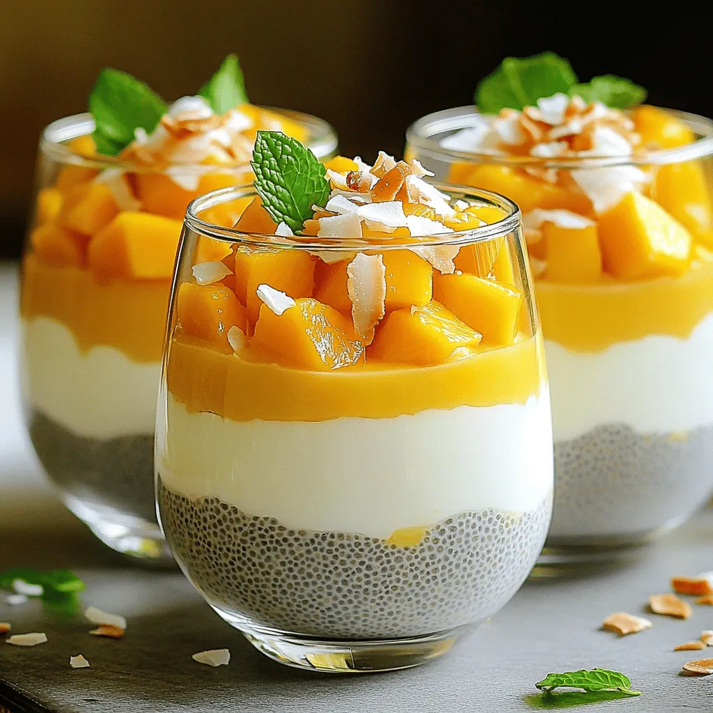 Once the pudding has chilled, give it a stir. If it feels too thick, add a splash of almond milk. Now it’s time to serve! Use small cups or bowls for a fun presentation. Start by adding a layer of the chia pudding. Then, add a layer of the diced mango on top. Repeat these layers until the cups are full. To finish, sprinkle toasted coconut flakes on the top. Add fresh mint leaves for a pop of color and a fresh taste. For an extra touch, drizzle a swirl of coconut milk on top before serving. Enjoy this tropical delight!