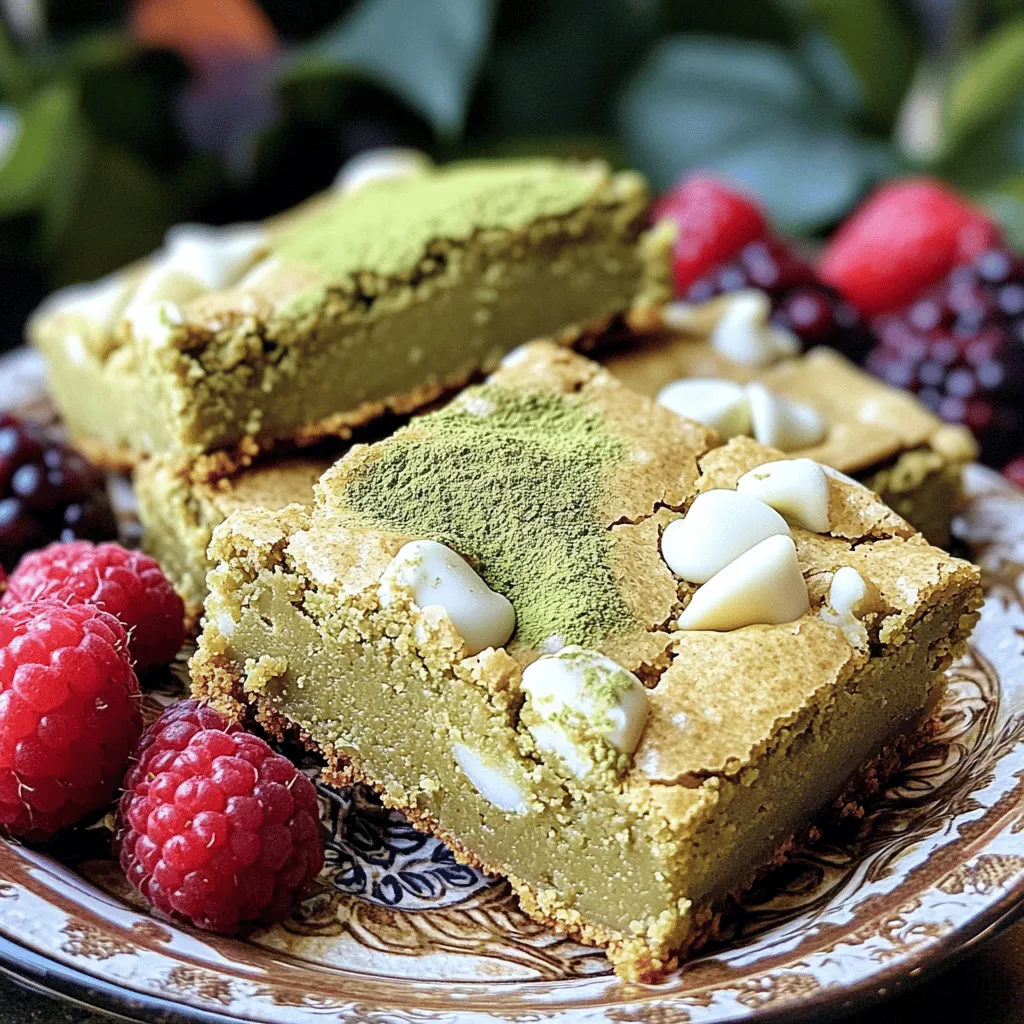 - 1/2 cup unsalted butter - 1 cup packed brown sugar - 1/4 cup granulated sugar - 1 large egg - 1 teaspoon vanilla extract - 1 cup all-purpose flour - 1 tablespoon matcha powder - 1/2 teaspoon baking powder - 1/4 teaspoon salt - 1 cup white chocolate chips - Light dusting of matcha powder - Fresh berries for serving You will need simple, fresh items for these blondies. Start with unsalted butter. It adds creaminess without extra salt. Brown sugar gives a deep, rich flavor. You can use granulated sugar too. This mix adds sweetness and helps with texture. Next, grab a large egg. It binds all the ingredients and helps the blondies rise. A teaspoon of vanilla extract brings warmth and comfort to every bite. Now, for the dry ingredients. All-purpose flour forms the base. Matcha powder gives that bright green color and earthy taste. Baking powder makes these blondies fluffy. A little salt balances the sweetness. Finally, white chocolate chips add creamy bursts of flavor. Optional garnishes can make a big difference. A light dusting of matcha on top looks pretty and adds taste. Fresh berries on the side add a pop of color and freshness. They also pair nicely with the sweet blondies. Enjoy creating these delicious treats with these simple ingredients! - Preheat your oven to 350°F (175°C). - Prepare your baking pan with parchment paper. Start by preheating your oven. This step warms the oven for even baking. Line an 8-inch square pan with parchment paper. Leave some paper hanging over the edges; this helps you lift the blondies out later. - Combine wet ingredients: butter, brown sugar, and granulated sugar. - Add in egg and vanilla extract for flavor. In a mixing bowl, whisk the melted butter, brown sugar, and granulated sugar. Mix until the blend is smooth. Next, crack in a large egg and add one teaspoon of vanilla extract. Whisk these in, ensuring everything is well combined. - Sift and mix dry ingredients. - Combine wet and dry mixtures carefully. In a separate bowl, sift together one cup of all-purpose flour, one tablespoon of matcha powder, half a teaspoon of baking powder, and a quarter teaspoon of salt. Sifting breaks up clumps and evenly distributes the matcha. Gradually mix these dry ingredients into your wet mixture. Stir gently; overmixing can lead to a tough texture. - Pour batter into the prepared pan. - Bake duration and doneness indicators. Pour the batter into your prepared pan. Use a spatula to smooth the top. Bake for 20 to 25 minutes. You know the blondies are done when the edges are lightly golden. A toothpick inserted in the center should come out with a few moist crumbs. Let them cool for at least 10 minutes before lifting them out using the parchment paper. Set them on a wire rack to cool completely before cutting into squares. To make fudgy blondies, avoid overmixing the batter. Mix until just combined. Overmixing adds air and makes them cake-like. You want a dense, chewy feel. For the golden edge, watch your oven closely. Bake until the edges turn light golden brown. This usually takes about 20-25 minutes. A toothpick should come out with a few moist crumbs. Presentation matters! Serve these blondies on a nice plate. Sprinkle a light dusting of matcha powder on top. This adds color and a nice touch. Pair them with fresh berries. Berries give a pop of color and freshness. They balance the sweetness of blondies. Enjoy your creation! {{image_2}} You can spice up your matcha white chocolate blondies in fun ways. - Adding nuts: Try mixing in some chopped macadamia or pecans. These nuts add a nice crunch and flavor. They balance the sweetness of the blondies perfectly. - Different types of white chocolate: Use flavored white chocolate, like raspberry or coconut, for a twist. Each type will change the taste and make your blondies unique. You can adapt this recipe to fit your diet. - Gluten-free alternatives: Use gluten-free flour instead of all-purpose flour. This swap keeps the blondies soft and tasty without gluten. - Vegan substitutions: Replace the egg with a flax egg or applesauce. Use vegan butter and dairy-free white chocolate. These changes make the recipe vegan-friendly while still delicious. These variations let you enjoy matcha white chocolate blondies in new ways. Customize them to fit your taste or dietary needs. To keep your Matcha White Chocolate Blondies fresh, follow these simple steps: - Cool Completely: Always let your blondies cool fully before storing. This helps avoid sogginess. - Use Airtight Containers: Place them in a clean, airtight container. This keeps moisture out and flavor in. - Layer with Parchment Paper: If stacking, use parchment paper between layers. This prevents sticking and maintains shape. - Store at Room Temperature: Keep them in a cool, dark place. They stay fresh at room temperature for about 3 to 4 days. Freezing blondies is a great way to enjoy them later. Here’s how to do it right: - Wrap Individually: Wrap each blondie in plastic wrap. This prevents freezer burn and keeps them tasty. - Place in a Freezer Bag: Put the wrapped blondies in a freezer-safe bag. Remove as much air as possible before sealing. - Label and Date: Write the date on the bag. You’ll know how long they’ve been stored. - Freezing Time: They can last up to 3 months in the freezer. When you’re ready to eat, thaw them: - In the Fridge: Move them to the fridge overnight for a slow thaw. This keeps them from getting soggy. - At Room Temperature: For a quicker method, leave them out for about an hour. Enjoy your delicious blondies! You can use green tea powder, but the taste will change. Matcha has a rich, creamy flavor. It is finely ground and bright green. Green tea powder lacks this depth. If you use it, expect a lighter flavor. You might want to add more to get a stronger taste. Check for a few signs. Look for golden edges on the blondies. The center should not jiggle too much. A toothpick inserted in the center should come out with a few moist crumbs. If i