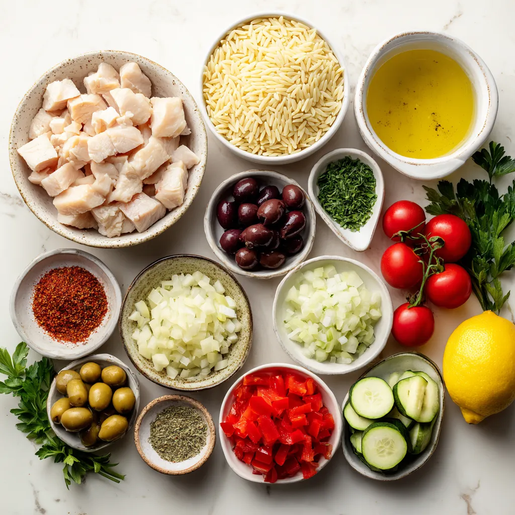 To start, gather all your ingredients. This makes cooking easier. You will need chicken, orzo, broth, and veggies. Chop the onion, garlic, bell pepper, and zucchini. Halve the cherry tomatoes and slice the olives. This prep helps the dish come together smoothly.