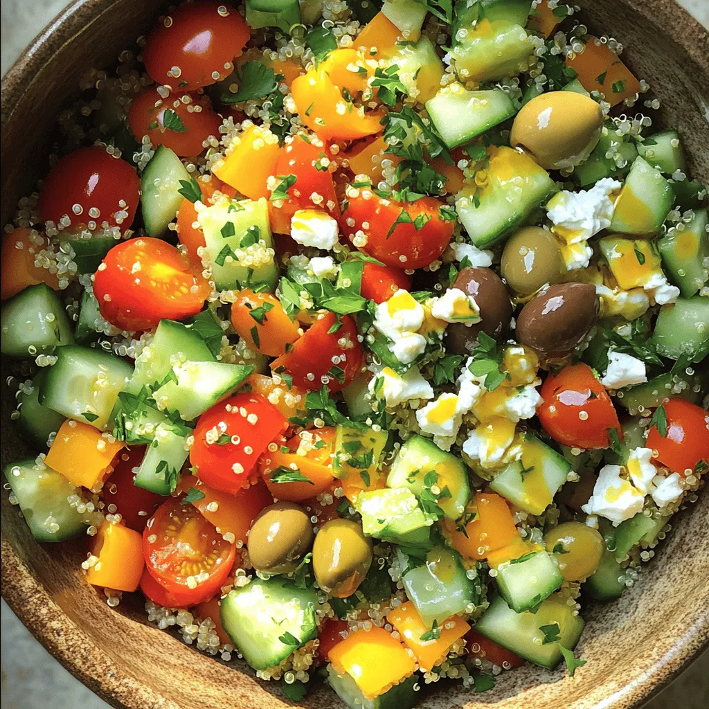 - 1 cup quinoa, rinsed - 2 cups vegetable broth or water - 1 cup cherry tomatoes, halved - 1 cucumber, diced - 1 bell pepper (any color), diced - 1/2 red onion, finely chopped - 1/2 cup Kalamata olives, pitted and halved - 1/2 cup feta cheese, crumbled (optional for a dairy-free version) - 1/4 cup fresh parsley, chopped - 1/4 cup fresh mint, chopped The main ingredients bring life to the Mediterranean quinoa salad. Quinoa is the star here. It is a great source of protein and fiber. Rinsing the quinoa removes any bitterness. The fresh vegetables add color and crunch. Cherry tomatoes bring sweetness. Cucumbers and bell peppers give a nice crisp bite. Red onions add a mild sharpness. Kalamata olives introduce a briny flavor. Lastly, feta cheese is an optional touch that adds creaminess. - 3 tablespoons olive oil - 2 tablespoons lemon juice - 1 teaspoon dried oregano - Salt and pepper to taste The dressing ties everything together. Olive oil gives richness and a smooth texture. Lemon juice adds brightness and zing. Dried oregano enhances the Mediterranean flavor profile. Season with salt and pepper to your liking. - Approximately 200 calories per serving - Rich in protein, fiber, vitamins, and minerals This salad is not just tasty; it is also healthy. Each serving has around 200 calories. You will find protein and fiber from quinoa. Fresh vegetables provide vitamins. The olives and olive oil offer healthy fats. Enjoy this dish as a light meal or a side, and savor the goodness of every bite. For the complete recipe, check the Full Recipe section. 1. Rinse and Boil Start by rinsing 1 cup of quinoa under cold water. This removes any bitterness. In a medium saucepan, bring 2 cups of vegetable broth or water to a boil. Once boiling, add the rinsed quinoa. 2. Simmering and Fluffing Reduce the heat to a simmer. Cover the pot and cook for about 15 minutes. The quinoa will absorb all the liquid. After 15 minutes, remove the pot from heat. Let it sit, covered, for 5 more minutes. Then, fluff the quinoa with a fork and let it cool. 1. Chopping Vegetables While the quinoa cools, chop your fresh veggies. Dice 1 cucumber, 1 bell pepper, and finely chop 1/2 of a red onion. Cut 1 cup of cherry tomatoes in half. 2. Combining Ingredients In a large mixing bowl, add the chopped vegetables. Also, add 1/2 cup of Kalamata olives (pitted and halved), 1/2 cup of crumbled feta cheese (if using), 1/4 cup of fresh parsley, and 1/4 cup of fresh mint. 1. Whisking Together In a small bowl, whisk together 3 tablespoons of olive oil, 2 tablespoons of lemon juice, 1 teaspoon of dried oregano, and some salt and pepper. This dressing adds a bright flavor to the salad. 1. Mixing Salad and Dressing Once the quinoa is cool, add it to the large bowl of vegetables. Pour the dressing over the top. Gently toss everything together until well combined. 2. Adjusting Seasoning Taste your salad and adjust the seasoning with extra salt and pepper if needed. You can now serve your Mediterranean quinoa salad chilled or at room temperature. For the complete recipe, check out the [Full Recipe]. Quinoa comes in different types. The most common types are white, red, and black. White quinoa tastes milder and is light and fluffy. Red quinoa has a nutty flavor and stays firmer when cooked. Black quinoa adds a lovely color and a slightly sweet taste. To cook quinoa perfectly, rinse it well. Rinsing removes bitter saponins, giving a better taste. Use a ratio of two cups of liquid for every cup of quinoa. Bring the liquid to a boil, then add the rinsed quinoa. Turn the heat down and cover it. Let it simmer for about 15 minutes. Once the liquid is gone, let it sit for five minutes. Fluff it with a fork for a light texture. You can prepare Mediterranean quinoa salad in advance. Cook the quinoa and let it cool. Chop the veggies and store them in the fridge. Keep the dressing in a separate container. This way, the flavors stay fresh. To store your salad, use an airtight container. It stays fresh for up to three days in the fridge. If you want to enjoy it later, keep the dressing separate until serving to avoid sogginess. Serve your quinoa salad with grilled chicken or fish for a full meal. You can also pair it with pita bread or hummus for a tasty snack. For a beautiful presentation, use a large bowl or a platter. Arrange the salad in the center and sprinkle some fresh herbs on top. This adds color and makes it look appetizing. You can find the full recipe for this refreshing dish and more ideas in the Mediterranean Quinoa Salad section. {{image_2}} To make this salad vegan, you can swap out the feta cheese. Some great substitutes are: - Nutritional yeast: Adds a cheesy flavor without dairy. - Tofu feta: Crumbled tofu marinated in lemon juice, garlic, and herbs gives a nice texture. - Avocado: Creamy and rich, it adds healthy fats. These swaps keep the salad fresh and tasty. You can boost this salad's nutrition by adding more ingredients. Consider these options: - Chickpeas: They add protein and fiber. - Grilled chicken: This makes it heartier and adds flavor. - Seasonal vegetables: Try bell peppers in summer or roasted squash in fall. Adding these ingredients makes the salad filling and fun. Get creative with dressings and herbs to change the flavor. Here are some ideas: - Different dressings: Try a balsamic vinaigrette or tahini dressing for a new taste. - Herbs and spices: Experiment with basil, dill, or cumin to enhance flavor. These twists make each bite exciting and unique. For the full recipe, check out the Mediterranean Quinoa Salad section above. You can serve Mediterranean quinoa salad cold. It tastes great straight from the fridge. If you prefer it warm, heat it gently. Use a microwave for about 30 seconds. Stir it well to heat evenly. This salad lasts for about 3 to 5 days in the refrigerator. Keep it in an airtight container. This helps keep it fresh and tasty. The flavors may get better over time as they meld together. Yes, you can freeze M