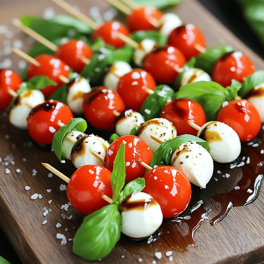 ![To make tasty Mini Caprese Skewers, you need a few key items. Here’s what to gather: - 1 pint cherry tomatoes - 8 ounces fresh mozzarella balls (bocconcini) - Fresh basil leaves - 2 tablespoons balsamic glaze - 1 tablespoon extra virgin olive oil - Salt and pepper to taste - Skewers (4-6 inch long) These ingredients create a mix of fresh, bright flavors. The tomatoes add sweetness, while mozzarella gives a creamy texture. Basil brings a fragrant note that ties them all together. Feel free to add your personal touch with these optional items: - A sprinkle of red pepper flakes for heat - Prosciutto for a savory twist - Different types of cheese, like feta or goat cheese - Cherry peppers for extra flavor These ingredients can enhance the dish or change it up to suit your taste. Choosing the right ingredients is key for great skewers. Here’s how to select fresh produce: - Tomatoes: Look for firm, shiny cherry tomatoes without blemishes. - Mozzarella: Choose mozzarella balls that are plump and packed in water for freshness. - Basil: Pick bright green leaves with no brown spots. Fresh basil should smell strong and sweet. Fresh ingredients make all the difference. They bring vibrant flavors and textures to your skewers. For the complete preparation, check out the Full Recipe. First, rinse the cherry tomatoes under cold water. Pat them dry with a clean towel. Next, take the fresh mozzarella balls and drain any extra liquid from the packaging. This step helps keep the skewers from getting soggy. Grab your skewer and begin threading. Start with one cherry tomato. Then, add a fresh basil leaf. Follow it up with a mozzarella ball. Repeat this process for each skewer. Aim for about three to four sets of tomato, basil, and mozzarella. Leave some space at each end for easy handling. Once you finish, lay the skewers on a serving platter. Drizzle the extra virgin olive oil over the skewers. Next, sprinkle with salt and pepper to taste. Finally, add a generous drizzle of balsamic glaze. This step adds flavor and makes your dish look beautiful. You can serve them right away or chill in the fridge for up to an hour. This waiting time helps the flavors blend nicely. Enjoy your Mini Caprese Skewers as a fresh, tasty snack! For the full recipe, check out the provided link. To make the best Mini Caprese Skewers, follow these tips: - Use ripe cherry tomatoes. They add sweet flavor. - Choose fresh mozzarella balls for a creamy texture. - Select bright green basil leaves for a fragrant touch. - Soak wooden skewers in water. This keeps them from burning. - Space the items evenly for a nice look. Avoid these common errors when making skewers: - Don’t overcrowd the skewer. Leave space for easy eating. - Avoid using old or wilted ingredients. Freshness matters! - Don’t skip the seasoning. Salt and pepper enhance taste. - Keep the skewers chilled before serving. This keeps them fresh. To boost the flavor of your Mini Caprese Skewers, try these ideas: - Add a dash of lemon juice for brightness. - Mix herbs like oregano or thyme with the basil. - Experiment with flavored olive oil for a unique twist. - Serve with a side of pesto for dipping. - Consider adding a sprinkle of crushed red pepper for heat. For a complete guide, check out the Full Recipe. {{image_2}} You can switch up the ingredients for Mini Caprese Skewers. Here are some ideas: - Grape Tomatoes: If cherry tomatoes are not available, use grape tomatoes. They taste sweet and work well. - Mozzarella Alternatives: Try using burrata cheese for a creamier texture. Feta cheese also adds a nice tang. - Herb Variations: Use mint or parsley instead of basil for a different flavor. These herbs bring a fresh twist. Mixing flavors can make your skewers stand out. Here are some fun combinations to try: - Pesto Drizzle: Instead of balsamic glaze, drizzle pesto over your skewers. It adds richness and a burst of flavor. - Spicy Kick: Add a slice of jalapeño or a dash of red pepper flakes. This adds heat and excitement. - Sweet Touch: Include a slice of fresh peach or strawberry for a sweet contrast. It balances the saltiness of cheese. You can adapt Mini Caprese Skewers for various diets: - Vegan Version: Replace mozzarella with avocado slices or marinated tofu. Both options are creamy and delicious. - Gluten-Free: The recipe is already gluten-free! Just ensure your balsamic glaze has no added gluten. - Low-Carb: Skip the tomatoes and use only mozzarella and basil. This keeps it light and keto-friendly. For the full recipe, check out the [Full Recipe] section. Enjoy exploring these variations! To store Mini Caprese Skewers, place them in an airtight container. Cover the container tightly to keep air out. You can store them in the fridge for up to two days. This keeps the ingredients fresh and tasty. If you want to make them ahead, prep the ingredients separately and assemble close to serving. Keep cherry tomatoes and mozzarella balls in their original packaging until ready to use. Store fresh basil in a glass of water, like a flower bouquet. This helps keep the basil vibrant and green. When storing skewers, avoid stacking them. This prevents squishing and keeps them looking nice. Mini Caprese Skewers are best served cold. If you have leftovers, enjoy them straight from the fridge. If you prefer them warm, you can briefly heat them in the microwave. Just 10-15 seconds should be enough. Be careful not to overheat, or the mozzarella may become rubbery. For a warm twist, try grilling them for a few minutes to enhance the flavor. You can prepare Mini Caprese Skewers a few hours in advance. Simply follow the steps to assemble the skewers. After they are made, cover them with plastic wrap. Store them in the fridge until you are ready to serve. This helps keep them fresh. Just remember to drizzle the balsamic glaze right before serving. The glaze can make the skewers soggy if added too early. Enjoy the flavors that develop from resting! Yes, you can make Mini Caprese Skew