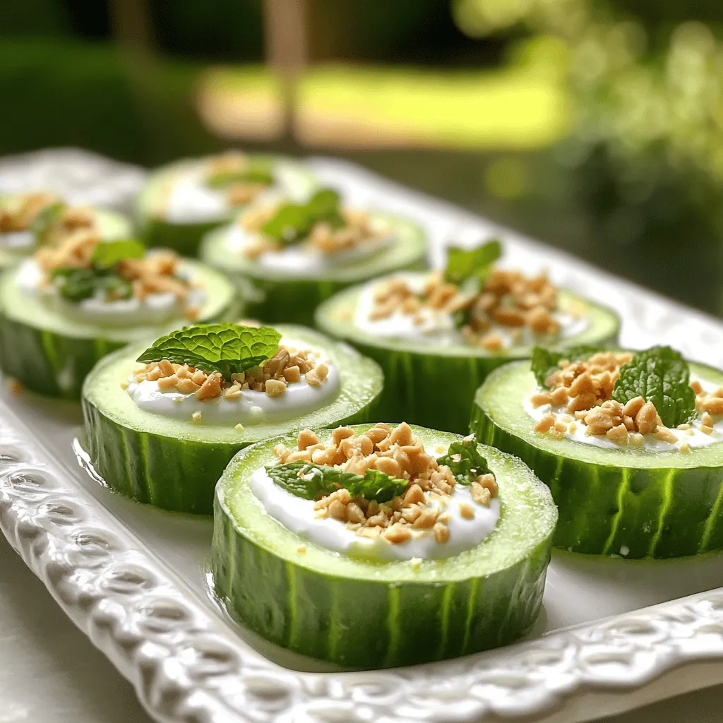 Mint Pickle Cucumber Cups combine fresh flavors in a simple snack. This easy recipe features crunchy cucumbers filled with a mint and yogurt blend. You can prepare this dish in about 35 minutes, making it perfect for gatherings or a quick treat. - 2 large cucumbers - 1 cup mint leaves, finely chopped - 1/2 cup plain yogurt - 2 tablespoons lemon juice - 1 tablespoon olive oil - 1 teaspoon cumin powder - 1 teaspoon chili powder - 1/2 teaspoon salt - Black pepper to taste - 1/4 cup roasted peanuts, crushed (for garnish) You can swap cucumbers with zucchini for a different taste. If you prefer, use Greek yogurt instead of plain yogurt for more creaminess. Fresh herbs like dill or cilantro can replace mint if you want a new flavor. You can also use apple cider vinegar instead of lemon juice for a tangy kick. Start with two large cucumbers. Slice them in half lengthwise. Use a small spoon to scoop out the seeds. This creates little boats or cups. Set these cucumber cups aside for later. In a mixing bowl, chop one cup of fresh mint leaves. Then, add half a cup of plain yogurt. Next, squeeze in two tablespoons of lemon juice. Drizzle in one tablespoon of olive oil. Sprinkle in one teaspoon of cumin powder and one teaspoon of chili powder. Add half a teaspoon of salt and black pepper to taste. Mix all these ingredients well. You want a creamy, green filling that smells fresh and inviting. Now, take a spoon and fill each cucumber cup with the mint yogurt mixture. Pack it gently to make it look nice. Once filled, sprinkle crushed roasted peanuts on top. This adds a great crunch and flavor contrast. For even better taste, chill the cucumber cups for at least 20 minutes. This allows the flavors to blend. When you’re ready to serve, place them on a platter. Enjoy this refreshing snack that’s easy to make and fun to eat! You can find the full details in the Full Recipe. Choose firm cucumbers with smooth skin. Look for bright green color, too. Avoid cucumbers that feel soft or have blemishes. If you can, pick organic cucumbers for the best taste. Fresh cucumbers are key to making your Mint Pickle Cucumber Cups shine. Want to add more flavor? Try mixing in some diced tomatoes or red onion. A sprinkle of feta cheese can also add a nice touch. You can swap the cumin for smoked paprika for a different twist. Each of these will give the cups a unique flavor. To save time, prepare the mint filling in advance. You can make it the night before and store it in the fridge. Just fill the cucumber cups when ready to serve. For quicker prep, use a melon baller to scoop out the seeds. This makes it easy and fun to create your cups. Check out the Full Recipe for more detailed steps! {{image_2}} If you want to switch up the filling, consider using cream cheese. You can mix in herbs like dill for a fresh taste. Another option is to use hummus. Hummus adds a rich, creamy texture without dairy. You can even try a spicy bean dip for a bold flavor. Each of these options brings a unique twist to your cucumber cups. To enhance flavor, think about adding garlic or onion powder to the mint filling. A pinch of smoked paprika can add warmth. For a tangy kick, add a splash of hot sauce. You can also mix in diced tomatoes or bell peppers for extra crunch. These small changes can make your snack even more exciting. Mint Pickle Cucumber Cups pair well with many dishes. Try serving them alongside grilled meats or fish for a fresh contrast. They also work great as a side with spicy curries. For a light lunch, serve them with a crisp salad. You can even add them to a platter with other appetizers. This makes your meal colorful and fun. For the full recipe, check out the Mint Pickle Cucumber Cups section above. To keep your Mint Pickle Cucumber Cups fresh, place them in an airtight container. If you have extra filling, store it separately. This way, your cucumbers stay crisp and do not get soggy. Cover the container with plastic wrap for added protection. When stored properly in the fridge, these cucumber cups last up to two days. After that, the cucumbers may lose their crunch. The filling should stay good for about three days. Always check for off smells or changes in texture before eating. You can prepare the filling a day in advance. This saves time and allows flavors to mix well. Just keep it in the fridge until you are ready to fill the cucumber cups. Slice the cucumbers just before serving to keep them firm. This method ensures your Mint Pickle Cucumber Cups stay refreshing and delightful. For the full recipe, refer to the section above. Yes, you can make Mint Pickle Cucumber Cups ahead of time. Prepare the cucumber cups and the mint filling separately. Store the filling in the fridge. When you’re ready to serve, fill the cucumber cups. This keeps them fresh and crunchy. The flavors blend nicely if you chill them for a while before serving. I recommend making them a few hours ahead for the best taste. These cucumber cups pair well with many dishes. You can serve them with grilled meats or fish. They also go great with flatbreads or rice dishes. For a light meal, add some salad or hummus. If you want something fun, serve them at a party with other snacks. They are a great palate cleanser. You can also serve them with a refreshing drink like lemonade or iced tea. Yes, cucumbers and mint offer many health benefits. Cucumbers are low in calories and high in water. They keep you hydrated and help with digestion. Mint adds flavor without extra calories. It can help soothe your stomach. Mint also has antioxidants, which fight free radicals. Together, they make a tasty snack that is good for you. Enjoy your Mint Pickle Cucumber Cups as a healthy treat! This blog post covered how to make fresh Mint Pickle Cucumber Cups. We went over the full recipe, ingredient substitutions, and step-by-step instructions. I shared tips for choosing the best cucumbers, quick prep ideas, and ways to enhance flavor. You can try different fillings and se