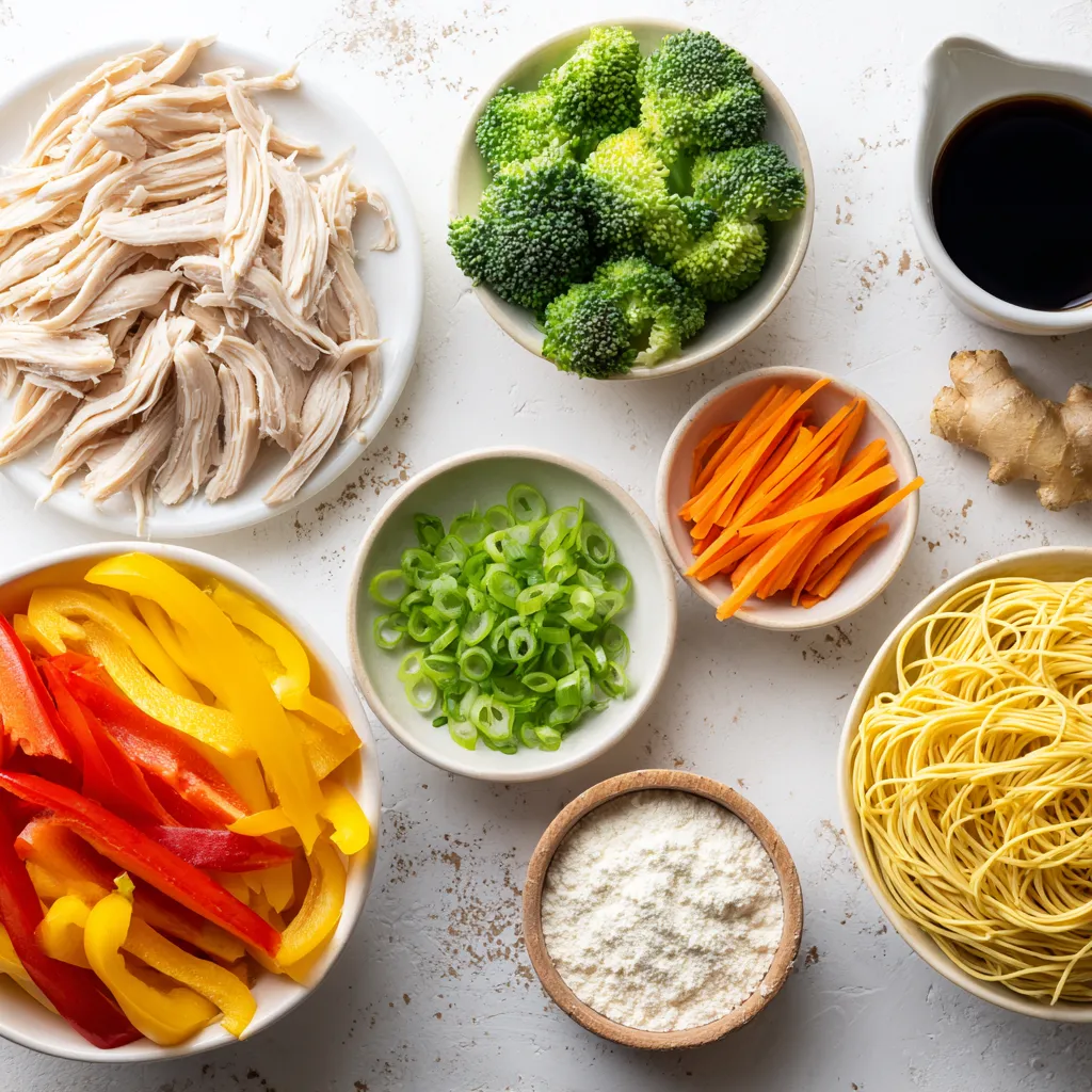 Lo mein noodles are the base of this dish. They have a nice bite and soak up the sauce well. Thinly sliced chicken breast cooks quickly and adds protein. The mix of veggies gives color, crunch, and nutrients. Broccoli, bell peppers, and carrots work well together, but feel free to swap them out for favorites.