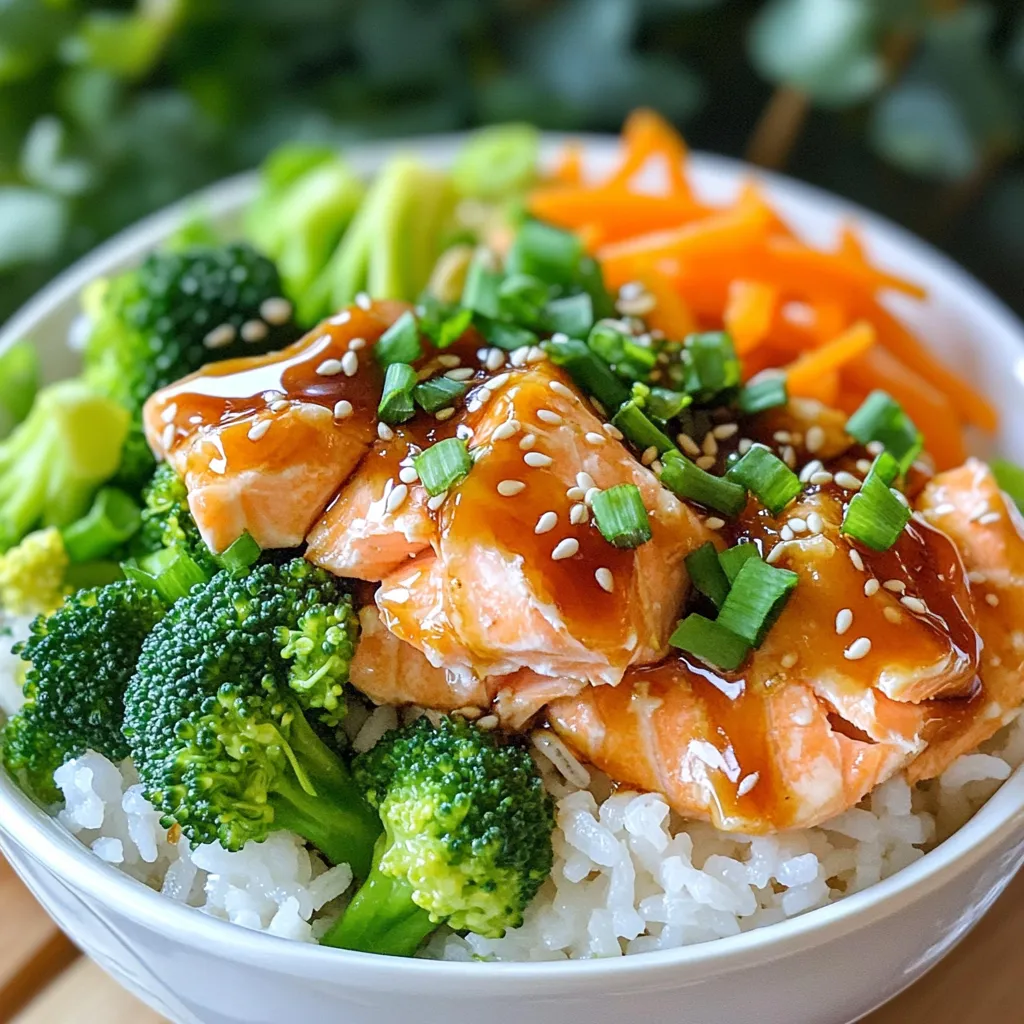 Now, I’m ready to assemble the bowls. First, I divide the cooked jasmine rice into serving bowls. I like to use equal portions for a nice look. After that, I add the flaked teriyaki salmon on top. Next, I layer steamed broccoli florets and julienned carrots. These veggies add color and crunch. Finally, I sprinkle sliced green onions and sesame seeds on top. This step adds flavor and makes the dish pop. If there’s any teriyaki sauce left in the pan, I drizzle that over the bowls. Now, it’s ready to serve!