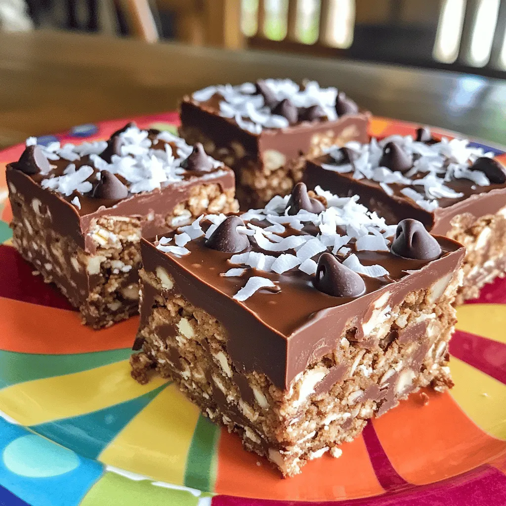 To make these no-bake chocolate oat bars, you need some basic ingredients. Here’s what you will need: - 2 cups rolled oats - 1 cup almond butter (or peanut butter) - 1/2 cup honey or maple syrup - 1/2 cup unsweetened cocoa powder - 1/4 cup chia seeds - 1/4 teaspoon salt - 1/2 teaspoon vanilla extract - 1/2 cup dark chocolate chips (dairy-free if preferred) These ingredients work together to create a rich, chewy treat. The oats give the bars structure. The nut butter adds creaminess. Honey or maple syrup sweetens without refined sugar. Cocoa powder brings the chocolatey flavor, while chia seeds boost nutrition. You can add a few extra ingredients to enhance the taste: - 1/4 cup shredded coconut (optional) - A pinch of cinnamon or nutmeg for warmth - A scoop of protein powder for an extra boost Adding shredded coconut gives a nice texture. The spices can elevate the taste. Protein powder makes these bars a great post-workout snack! If you need to make substitutions, you have options: - Use sunflower seed butter instead of almond or peanut butter for a nut-free version. - Swap honey for agave syrup if you want a vegan option. - Replace dark chocolate chips with dried fruit for a different flavor. These substitutions keep the bars tasty while meeting your needs. Feel free to get creative! Making No Bake Chocolate Oat Bars is simple. You need basic tools and ingredients. Start with a large bowl and a baking dish. Gather your ingredients first. This helps keep the process smooth and fun. 1. Mix the Dry Ingredients: In a large mixing bowl, combine 2 cups of rolled oats, 1/2 cup of unsweetened cocoa powder, and 1/4 teaspoon of salt. This forms the base of your bars. 2. Add the Wet Ingredients: Next, add 1 cup of almond butter and 1/2 cup of honey or maple syrup. This mix adds sweetness and creaminess. 3. Incorporate Chia Seeds: Toss in 1/4 cup of chia seeds. They give added texture and nutrition. Mix everything until you get a sticky mixture. If it’s hard to mix, use your hands. 4. Flavor It Up: Add 1/2 teaspoon of vanilla extract. Stir well to blend all flavors together. 5. Add Chocolate Chips: Fold in 1/2 cup of dark chocolate chips. If you like, you can also add 1/4 cup of shredded coconut for extra flavor. 6. Prepare the Baking Dish: Line an 8x8-inch square baking dish with parchment paper. Leave some overhang. This makes it easy to lift the bars out later. 7. Press the Mixture: Transfer the mixture into the lined dish. Use a spatula to press it down firmly. Make sure it’s even across the top. 8. Chill the Bars: Refrigerate for at least 2 hours. This helps the bars firm up. They need to be set before cutting. 9. Slice and Serve: Once firm, lift the bars out using the parchment paper. Cut into squares or rectangles. Enjoy your tasty treat! For a visual guide, you can create photos of each step. Take pictures of mixing the ingredients, pressing the mixture into the dish, and the final product. This will help others see how easy it is to make these bars. For the full recipe, refer back to the ingredients and steps mentioned above. To make the best no bake chocolate oat bars, follow these steps: - Use fresh ingredients. Fresh oats and nut butter make a big difference. - Mix well. Ensure that all ingredients blend into a sticky mixture. This helps the bars hold together. - Press firmly. When you put the mixture in the dish, press down hard. This creates a solid base. - Chill thoroughly. Let the bars set in the fridge for at least two hours. This helps them firm up nicely. You can make these bars your own! Here are some ideas: - Try different nut butters. Almond, cashew, or even sunflower seed butter work well. - Add spices. A pinch of cinnamon or nutmeg can add warmth and depth. - Incorporate fruits. Dried fruits like cranberries or apricots add a chewy texture. - Change the chocolate. Use white chocolate chips or even carob chips for a twist. Be aware of these common pitfalls: - Not measuring ingredients. Use measuring cups for accuracy. This ensures the right texture. - Skipping the chilling step. If you don’t chill long enough, the bars may crumble. - Overmixing. Too much mixing can make the bars dry. Mix just until combined. - Using old ingredients. Old oats or nut butter can affect the taste. Always check freshness. By following these tips and tricks, you will create delicious, satisfying no bake chocolate oat bars. For the full recipe, check out the detailed instructions above. {{image_2}} You can switch up the nut or seed in your bars. Instead of almond butter, try cashew or sunflower seed butter. These choices add unique flavors. Feel free to mix in nuts like walnuts or pecans. They add crunch and taste. You can also try different seeds. Pumpkin seeds or hemp seeds work well. They boost nutrition and taste great. Add fun flavors to your bars! For a minty twist, mix in mint extract. You can also use peanut butter instead of almond butter. This gives a rich flavor that many love. Want something fruity? Add dried fruits like cranberries or raisins. They add sweetness and a chewy texture. You can even stir in spices like cinnamon for warmth. Making these bars vegan is easy. Just use maple syrup instead of honey. Also, check your chocolate chips. Use dairy-free ones for a vegan option. For gluten-free bars, ensure your oats are certified gluten-free. These small changes keep the flavor while meeting dietary needs. Enjoy these bars no matter your diet! You can store your No Bake Chocolate Oat Bars in an airtight container. Keep them in the fridge to maintain their firmness. This way, they stay fresh and tasty for a longer time. If you have leftovers, do not worry! These bars hold up well when stored correctly. To freeze these delicious bars, wrap each one in plastic wrap. Place them in a freezer-safe bag or container. When you want to enjoy one, take it out and let it thaw in the fridge for about an hour. You can also eat them straight from the freezer for a cool treat. Just remember, t