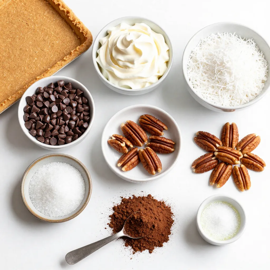 The semi-sweet chocolate chips give the pie its rich chocolate flavor. They melt down easily and mix well with cream. Heavy whipping cream makes the filling light and fluffy. It whips to soft peaks, which creates a nice texture. Sweetened shredded coconut adds a chewy bite and sweetness. Chopped pecans give crunch and a nutty taste. Cocoa powder deepens the chocolate flavor and adds richness. Finally, vanilla extract brings warmth and enhances all the flavors.