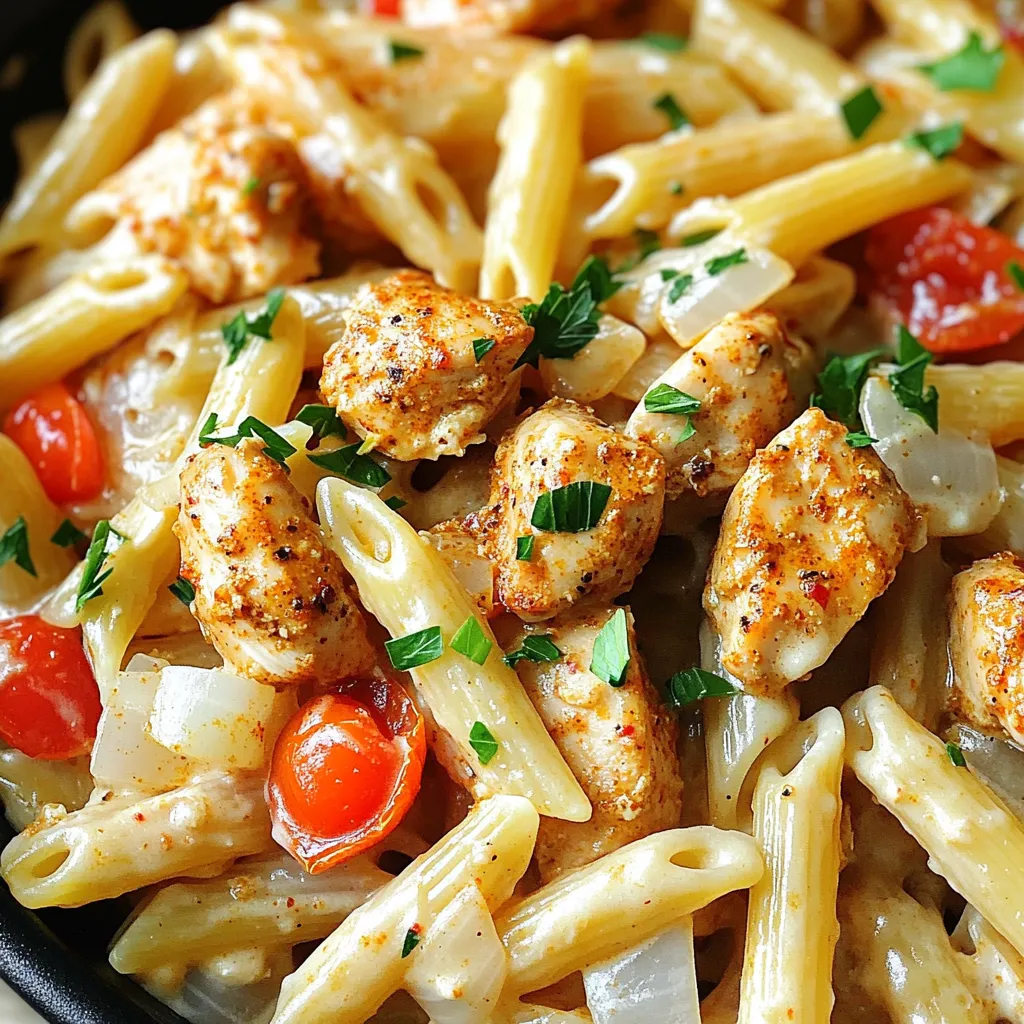 - Chicken: You need 2 boneless, skinless chicken breasts. Cut them into bite-sized pieces. This helps them cook faster and absorb flavor well. - Cajun seasoning: Use 1 tablespoon. This spice mix gives the dish its bold flavor. You can buy it or make your own with spices like paprika and cayenne. - Vegetables: The mix includes a medium onion, 2 cloves of garlic, 1 red bell pepper, and 1 cup of cherry tomatoes. These veggies add color and taste. - Olive oil: You'll need 2 tablespoons. This oil helps cook the chicken and vegetables and adds richness. - Chicken broth: Use 3 cups. It adds depth to the pasta and keeps it moist. - Heavy cream: One cup is needed. This gives the dish its creamy texture and makes it rich and satisfying. - Fresh parsley: Chopped parsley adds a fresh touch. It also adds color to your dish. - Grated Parmesan cheese: This cheese adds a salty, nutty flavor. Sprinkle it on top just before serving for extra taste. This simple list of ingredients will help you create a delicious One-Pan Creamy Cajun Chicken Pasta. Each component plays a key role in making the dish flavorful and enjoyable. - Seasoning the chicken: Start by cutting the chicken into small pieces. Place these in a bowl. Sprinkle 1 tablespoon of Cajun seasoning over the chicken. Toss well until every piece is coated. This will give your dish a warm, spicy flavor. - Chopping vegetables: Next, chop your veggies. Dice 1 medium onion and mince 2 cloves of garlic. Slice 1 red bell pepper into strips. Halve 1 cup of cherry tomatoes. Having these ready makes cooking easier and faster. - Sautéing the chicken: Heat 2 tablespoons of olive oil in a skillet over medium-high heat. Once hot, add the seasoned chicken. Cook for 5-7 minutes. Stir occasionally until the chicken turns golden and is no longer pink inside. Remove the chicken and set it aside. - Cooking the vegetables: In the same skillet, add the diced onion and minced garlic. Sauté for 2-3 minutes until the onion is clear. Then, toss in the sliced bell pepper and cherry tomatoes. Cook for another 3-4 minutes until the veggies are soft and fragrant. - Adding broth and pasta: Pour in 3 cups of chicken broth. Bring it to a boil. Once boiling, add 8 ounces of penne pasta. Stir to mix well. Lower the heat, cover the pan, and let it simmer. Cook for 10-12 minutes, stirring occasionally, until the pasta is al dente. - Stirring in cream: After the pasta is cooked, add the chicken back to the pan. Pour in 1 cup of heavy cream. Stir everything together. Cook for another 2-3 minutes until the dish is warm and creamy. Add salt and pepper to taste. To make your dish stand out, adjust the Cajun seasoning. Start with one tablespoon, then taste it. If you like more heat, add a little extra. Cajun seasoning can vary in spice levels. Always trust your taste buds! Cooking the pasta al dente is key for texture. This means it should be firm but not hard. Follow the pasta package instructions, but check it a minute early. It will keep cooking after you drain it. The best type of pan to use is a large skillet. A skillet allows for even cooking and enough space for all the ingredients. Make sure it has a lid for simmering the pasta. For utensils, use a wooden spoon for stirring. It won't scratch your pan and helps mix the ingredients well. A good set of measuring cups helps keep your portions accurate. Pair your creamy Cajun chicken pasta with a simple side salad. A fresh salad balances the rich flavors of the dish. You can also serve it with garlic bread for a tasty combo. To serve, garnish your pasta with fresh parsley and grated Parmesan cheese. This adds color and flavor. A sprinkle of black pepper on top adds a nice touch too! {{image_2}} You can switch the chicken for shrimp or sausage. Shrimp cooks fast and adds a nice twist. Just sauté it in the pan until it turns pink. Sausage gives a hearty flavor. Slice it and brown it with the veggies. For a vegetarian option, use mushrooms or chickpeas instead. They soak up the sauce and add great texture. Pasta shape matters! You can use rotini, farfalle, or even spaghetti. Each shape holds the sauce differently. If you need gluten-free options, use gluten-free pasta. Look for ones made from rice or chickpeas. They are tasty and work well in this dish. Want more flavor? Add spices like smoked paprika or cayenne for heat. Fresh herbs like basil or cilantro can brighten the dish. You can also toss in veggies like spinach or zucchini. They add color and nutrients. Just add them when you sauté your other veggies for a fresh taste. To store leftovers, let the pasta cool first. Place it in an airtight container. This keeps the flavors fresh. You can store it in the fridge for up to 3 days. I recommend using glass containers, as they do not absorb odors. The best way to reheat this pasta is on the stove. Use a skillet over medium heat. Add a splash of chicken broth or water to keep it moist. Stir often to warm it evenly. If you want to keep the creaminess, avoid the microwave. The microwave can make it dry and clumpy. Yes, you can freeze cooked pasta, but it may change the texture. To freeze, let it cool completely. Then, place it in a freezer-safe bag. Remove as much air as possible. It can last for up to 2 months in the freezer. To defrost, move the bag to the fridge overnight. For reheating, use the stove with a splash of broth. This helps maintain the creaminess. Stir gently to combine everything well. Enjoy your flavorful pasta again! What is Cajun seasoning made of? Cajun seasoning is a blend of spices. It often includes paprika, cayenne pepper, garlic powder, onion powder, and black pepper. Some mixes may add thyme and oregano for extra flavor. You can buy it pre-made or mix your own at home. Can I make this dish ahead of time? Yes, you can make this dish ahead of time. Cook it fully and let it cool. Store it in an airtight container in the fridge for up to three days. When ready to eat, just reheat it on the stove, adding a splash of 