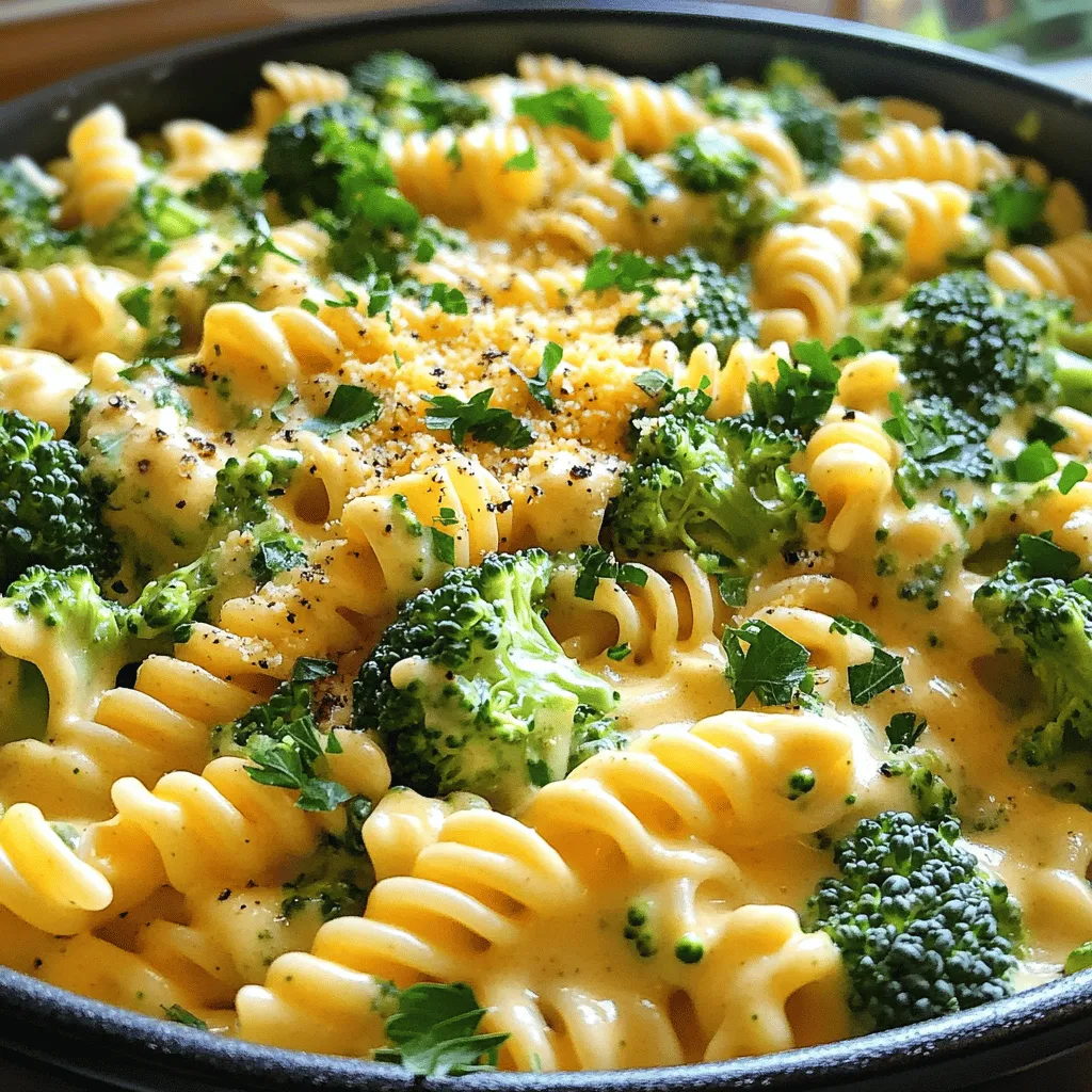 - 10 oz of pasta (fusilli or penne) - 2 cups broccoli florets - 4 cups vegetable broth - 1 cup heavy cream or full-fat coconut milk - 1 ½ cups sharp cheddar cheese, grated - 1 tablespoon olive oil - 3 cloves garlic, minced - Onion powder, garlic powder, salt, and pepper Gathering the right ingredients is key to a great dish. Here, you need just a few simple items to make this creamy pasta. You’ll start with 10 oz of pasta. Fusilli or penne works best for this recipe. Next, grab 2 cups of fresh broccoli florets. They add a nice crunch and nutrition. Then, you need 4 cups of vegetable broth. This broth gives flavor and moisture to the pasta. For the creamy aspect, use 1 cup of heavy cream or full-fat coconut milk. Both options will work well. You also want 1 ½ cups of sharp cheddar cheese. Grate it yourself for the best melt. Now, let’s talk seasonings. You will need 1 tablespoon of olive oil to sauté. Then, add 3 cloves of minced garlic for a fragrant base. For extra flavor, use onion powder, garlic powder, salt, and pepper. These spices will enhance the dish. These ingredients come together to create a rich and tasty meal. Make sure to have everything prepped before you start cooking. Enjoy the process! First, grab a large pot and add one tablespoon of olive oil. Heat it over medium heat. Once hot, toss in three cloves of minced garlic. Sauté the garlic for about one to two minutes. You want it to smell great but not turn brown. Next, add the dry pasta and two cups of broccoli florets to the pot. Stir everything together well. Now, pour in four cups of vegetable broth. Season with half a teaspoon of onion powder, half a teaspoon of garlic powder, and salt and pepper to taste. Stir once more to mix all the flavors. Bring the mixture to a boil. Once it bubbles, lower the heat to a simmer. Cover the pot and let it cook for about ten to twelve minutes. Stir occasionally. You want the pasta to be al dente and the broccoli to be tender. After the pasta is cooked, reduce the heat to low. Pour in one cup of heavy cream or full-fat coconut milk. Stir until it blends smoothly. Gradually add one and a half cups of grated sharp cheddar cheese. Keep stirring until the cheese melts fully and the sauce becomes creamy. Taste and adjust seasoning if needed. Your dish is nearly ready! To get a creamy sauce, stir continuously while adding cheese. This keeps the cheese from clumping. Start with a low heat as you add the cheese. Mix it in slowly. This helps the cheese melt evenly, making a smooth sauce. If you notice clumps forming, use a whisk. Whisking breaks them apart quickly. You can also add a splash of cream to help. This will keep your sauce silky and rich. Timing is key for perfect pasta and broccoli. Cook the pasta until it's al dente, which takes about 10-12 minutes. The broccoli should be tender but not mushy. Stir it every few minutes to prevent sticking. To enhance flavor, use fresh garlic. Fresh garlic gives a stronger taste than powdered. Adding a pinch of red pepper flakes can add a nice kick, too. Garnishing can make your dish look even better. Top your pasta with extra cheddar cheese for richness. Fresh parsley adds color and freshness. A sprinkle of black pepper gives a nice finish. Try adding toasted breadcrumbs for crunch. They add texture and flavor. Enjoy getting creative with your toppings! {{image_2}} You can boost your One Pot Creamy Broccoli Cheddar Pasta with proteins like chicken, shrimp, or tofu. - Chicken: Use cooked, shredded chicken. Add it in the last few minutes to warm through. - Shrimp: Add raw shrimp during the last 5 minutes of cooking. They cook quickly and add a nice flavor. - Tofu: Use firm tofu, cubed. Sauté it first for a crispy texture before adding it to the pot. Adjust cooking times to ensure your protein is fully cooked and safe to eat. Feel free to mix in other veggies for added nutrition and flavor. - Spinach: Add fresh spinach at the end for a pop of color and nutrients. - Carrots: Shredded carrots cook quickly and add sweetness. - Cauliflower: Substitute cauliflower for broccoli if you prefer. You can use seasonal vegetables to keep your dish fresh and exciting. This dish is easy to modify for different diets. - Vegan: Replace heavy cream with coconut milk and use vegan cheese. - Gluten-Free: Use gluten-free pasta. Ensure all other ingredients are gluten-free too. - Nut-Free: Most cheese options are nut-free, but check labels to be sure. These changes let anyone enjoy this creamy pasta dish! To store leftovers, let the pasta cool first. Place it in an airtight container. This keeps the dish fresh and tasty. You can keep it in the fridge for up to three days. If you want to enjoy it later, make sure to check for any signs of spoilage before eating. If you want to freeze the pasta, use a freezer-safe container. It’s best to freeze it without any garnishes. The pasta will stay good for about two months in the freezer. When you're ready to eat, thaw it overnight in the fridge. To reheat, warm it in a pot over low heat. Add a splash of broth or water to bring back its creaminess. You can prep this dish ahead of time. Cook the pasta and broccoli, then cool them separately. Store them in airtight containers. This way, you can combine them with the sauce fresh when you're ready to eat. It saves time on busy days and keeps the flavors bright. Yes, you can easily make this dish vegan. For the cheese, use a plant-based cheese. Choose a brand that melts well. For the cream, replace heavy cream with full-fat coconut milk or cashew cream. Both provide creaminess without dairy. Cooking pasta in this dish takes about 10-12 minutes. You will cook it until it's al dente. Stir occasionally to keep it from sticking. Make sure to check the pasta for doneness as cooking times can vary. This pasta pairs well with a simple side salad. A light green salad with vinaigrette works great. You can also serve it with garlic bread for a comforting meal. Roasted vegetables add 