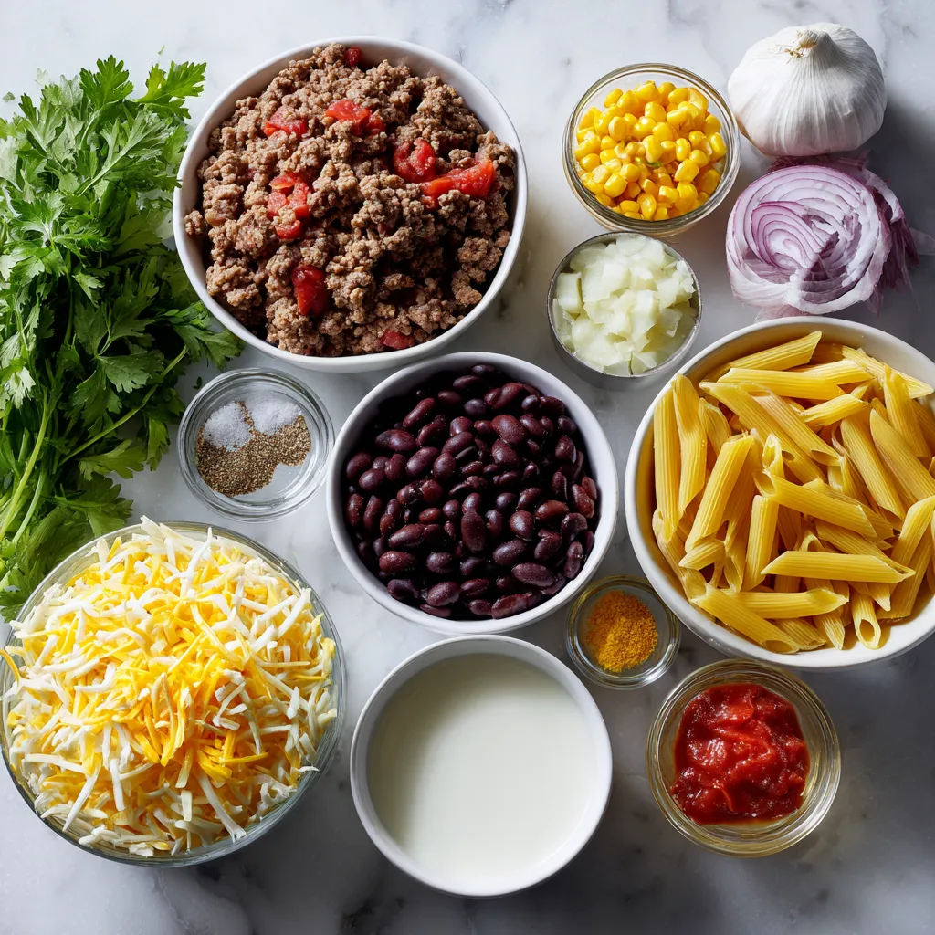 A delicious and easy one-pot meal combining pasta, ground meat, and taco flavors in a creamy sauce.
