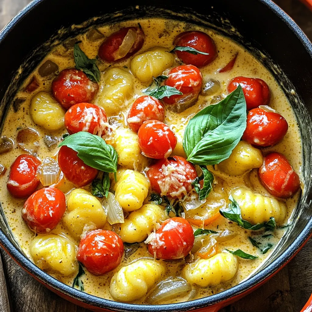 To make One-Pot Creamy Tomato Basil Gnocchi, you start with potato gnocchi. These soft dumplings are quick and easy to cook. Next, you need fresh cherry tomatoes. Halving them lets their sweet juices flow into the sauce. Heavy cream adds richness and makes the dish creamy. Vegetable broth gives it depth and flavor. Garlic and onion create a lovely base that brings the dish to life.