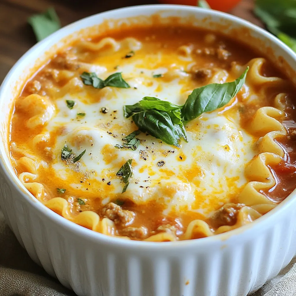 A comforting and cheesy lasagna soup made in one pot, perfect for a quick and hearty meal.