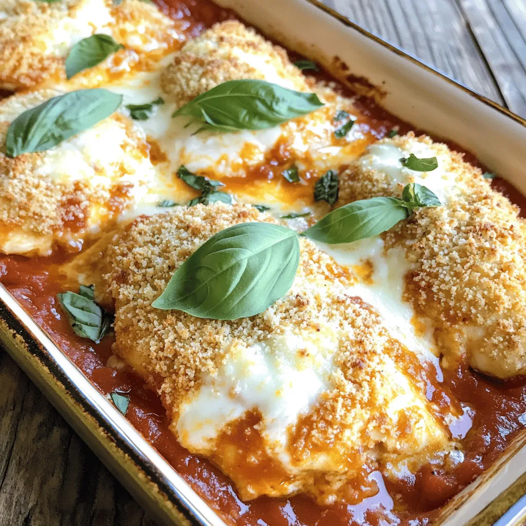 To make Oven-Baked Chicken Parmesan, you will need: - 4 boneless, skinless chicken breasts - 1 cup breadcrumbs (preferably panko for extra crunch) - 1/2 cup grated Parmesan cheese - 2 teaspoons Italian seasoning - 1 teaspoon garlic powder - 1 teaspoon salt - 1/2 teaspoon black pepper - 2 large eggs - 1 cup marinara sauce - 1 cup shredded mozzarella cheese - Fresh basil leaves for garnish (optional) You can add some extras to enhance the flavor: - Red pepper flakes for heat - Fresh herbs like oregano or thyme - Sliced olives for a briny touch - Spinach for added nutrition Each serving provides a good balance of nutrients: - Calories: 450 - Protein: 38g - Fat: 22g - Carbohydrates: 28g - Fiber: 2g - Sugar: 4g This dish combines protein and carbs, making it a filling meal. You can adjust the recipe to fit your dietary needs. For the full recipe, check the complete instructions above. To start, gather all your ingredients. You need chicken breasts, breadcrumbs, and eggs. This will make the process smooth. Preheat your oven to 400°F (200°C). This step helps cook the chicken evenly. Line a baking sheet with parchment paper. This keeps the chicken from sticking. Now, let's prepare the coating. In a shallow bowl, mix the breadcrumbs, Parmesan cheese, Italian seasoning, garlic powder, salt, and black pepper. Stir until everything is well combined. In another bowl, beat the two eggs until they are mixed well. Take a chicken breast and dip it in the beaten eggs. Make sure to let the excess egg drip off. Next, coat the chicken in the breadcrumb mixture. Press gently to ensure a good coating. Repeat this for all chicken breasts. Once done, place them on the prepared baking sheet. Now it's time to bake! Put the baking sheet in the oven and set a timer for 20 minutes. After 20 minutes, check the chicken. The outside should be golden and crispy. Remove the baking sheet from the oven. Spoon marinara sauce over each chicken breast. Make sure to cover them evenly. Next, sprinkle shredded mozzarella cheese on top of the sauce. This will melt and create a delicious layer. Return the baking sheet to the oven. Bake for an additional 10-15 minutes. You’ll know it’s ready when the cheese is melted and bubbly. Also, check that the chicken reaches an internal temperature of 165°F (75°C). After baking, take the chicken out of the oven. Let it rest for about 5 minutes. This helps the juices stay inside the chicken. If you like, add fresh basil leaves on top for a nice touch. Serve your Oven-Baked Chicken Parmesan with pasta or a side salad. It looks great and tastes even better! For the complete details on this recipe, check out the Full Recipe. To get your chicken extra crispy, use panko breadcrumbs. They are lighter and crunchier than regular breadcrumbs. Make sure to coat each chicken breast evenly. Press the breadcrumbs onto the chicken firmly. This helps them stick better during baking. Another tip is to spray the chicken lightly with cooking oil. This adds even more crispiness as it bakes. One mistake is not preheating your oven. If the oven isn’t hot enough, the chicken won’t crisp up. Another common error is skipping the egg wash. The egg helps the breadcrumbs stick, so don’t skip it. Also, avoid overcrowding the baking sheet. Give each piece space to cook evenly. Lastly, don’t skip resting the chicken. Letting it sit for a few minutes makes it juicier. Cook the chicken at 400°F (200°C) for the best results. Bake it for about 20 minutes before adding sauce and cheese. Check the chicken’s internal temperature. It should reach 165°F (75°C) to be safe to eat. If your cheese isn’t bubbling after 10-15 minutes, it may need a bit more time. Remember, every oven is different, so keep an eye on your chicken. For more details, refer to the Full Recipe. {{image_2}} You can make your Oven-Baked Chicken Parmesan healthier. Swap out breadcrumbs for crushed nuts or ground oats. Both options add crunch and fiber. For fewer calories, use less cheese or choose low-fat cheese. You can even use whole-grain breadcrumbs. These small changes keep flavor while cutting fat. While mozzarella cheese is classic, you can try other cheeses. Fontina melts well and adds a rich taste. Provolone offers a nice sharpness. You could also mix cheeses for a unique flavor. Just remember, the more cheese you add, the richer the dish will be. Add herbs and spices to boost flavor. Try fresh basil, oregano, or thyme for a fresh taste. You can sprinkle red pepper flakes for some heat. Garlic or onion powder adds depth to the dish too. Experiment with what you love to make it your own. Use these tips to create a version you’ll enjoy even more. For more ideas, check out the Full Recipe. After cooking, let the chicken cool down. Place it in an airtight container. Store it in the fridge for up to three days. If you want to keep it longer, consider freezing it instead. To reheat, preheat your oven to 350°F (175°C). Place the chicken on a baking sheet. Cover it with foil to keep it moist. Bake for about 15-20 minutes or until heated through. You can also use a microwave, but the oven keeps it crispy. You can freeze baked chicken Parmesan. Wrap each piece in plastic wrap. Then place them in a freezer-safe bag. It will last for up to three months. To cook, thaw it in the fridge overnight. Then, reheat it in the oven for the best results. For the full recipe, check out the earlier section. Yes, you can use frozen chicken breasts. Just remember to thaw them first. You can thaw them in the fridge overnight or use the microwave. Once thawed, follow the recipe as usual. It’s best to ensure they are fully thawed for even cooking. The chicken is fully cooked when it reaches 165°F (75°C) inside. Use a meat thermometer to check the temperature. If you don’t have one, cut into the thickest part. The meat should be white, and the juices should run clear. Avoid any pink color to ensure it’s safe to eat. Many sides go great with chicken 