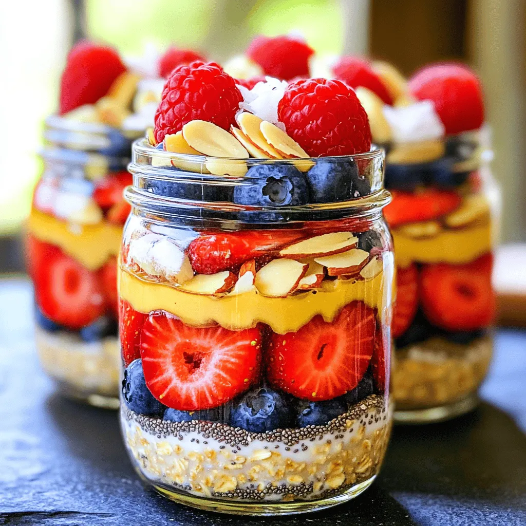 - 1 cup rolled oats - 1 ½ cups almond milk (or milk of choice) - 1 tablespoon chia seeds - 1 tablespoon maple syrup (optional) - 1 cup mixed berries (strawberries, blueberries, raspberries) - ½ teaspoon vanilla extract - A pinch of salt - Optional toppings: sliced almonds, coconut flakes, additional berries To make overnight oats with berries, gather these simple ingredients. Rolled oats form the base. They soak up the liquid and become soft by morning. Use almond milk or any milk you like. This adds a creamy texture. Chia seeds help thicken the oats and add fiber. Maple syrup is optional for sweetness. You can adjust it to your taste. Mixed berries bring color and flavor. Strawberries, blueberries, and raspberries create a fruity mix. A touch of vanilla extract enhances the taste. Finally, a pinch of salt balances all the flavors. You can add toppings like sliced almonds or coconut flakes for crunch. This makes your breakfast even more enjoyable. For the full recipe, check out the Berry Bliss Overnight Oats. - In a large bowl, combine 1 cup of rolled oats, 1 tablespoon of chia seeds, and a pinch of salt. Stir to mix well. - In another bowl, whisk together 1 ½ cups of almond milk, 1 tablespoon of maple syrup, and ½ teaspoon of vanilla extract until fully combined. - Pour the wet ingredients into the dry ingredients. Stir until everything is well mixed. - Gently fold in 1 cup of mixed berries. You can reserve some for topping later if you like. - Divide the mixture into jars or containers. This makes for an easy grab-and-go breakfast. - Seal the containers and refrigerate overnight. This helps the oats soak up all the tasty flavors. In the morning, stir the oats and taste for sweetness. Add more maple syrup if you want. Top with extra berries or other toppings you enjoy. You can find the full recipe above. To get the best texture in your overnight oats, soak them long enough. I recommend soaking for at least 6 hours. This allows the oats to absorb the liquid. If you prefer a thicker mix, use less milk. For a creamier texture, add more almond milk. Adjust it to match what you like best. Choosing the right milk can change the taste. I suggest almond milk for a light flavor. If you want something richer, try coconut milk or whole milk. Sweeteners can also enhance the taste. Maple syrup is a great choice, but honey or agave syrup works too. You can skip sweeteners if you use ripe berries. Serving in clear jars makes your dish look appealing. You can see the layers of oats and berries. For extra flair, try adding toppings. Sliced almonds or coconut flakes add crunch. A few extra berries on top make it pop. These small touches make your breakfast feel special. {{image_2}} You can change the taste of your overnight oats by using different types of berries. Strawberries, blueberries, and raspberries are great, but you can also try blackberries, cranberries, or even cherries. Each berry adds its unique flavor and nutrients. Mix and match to find your favorite combo. Adding nut butter or yogurt can give your oats a creamier texture. Almond butter or peanut butter adds a rich taste. Greek yogurt can make it more filling and add protein. Try experimenting with these additions to make your meal special. If you need a gluten-free option, use certified gluten-free oats. These oats are safe for people with gluten intolerance. Just check the package to ensure they meet the standards. For those who follow a vegan diet, stick to plant-based milk. Almond milk, oat milk, or coconut milk work well. You can also skip the honey and use maple syrup instead for sweetness. Incorporate seasonal fruits to keep it fresh and exciting. In summer, use peaches or plums. In autumn, add apples or pears. Using what’s in season not only boosts flavor but also supports local farmers. You can adapt your recipe based on what you find at the store. If you see ripe mangoes or juicy citrus fruits, toss them in. This way, your oats stay interesting all year long. For the full recipe, check out the Berry Bliss Overnight Oats. To keep your overnight oats fresh, store them in airtight containers. Glass jars work great for this. Place them in the fridge right after making. This helps the oats soak up the liquid and flavors. You can enjoy them cold in the morning. Prepared overnight oats last about 3 to 5 days in the fridge. If you notice any off smells or colors, it’s best to toss them. Yes, you can freeze overnight oats! Freezing is a good option if you want to save some for later. Use freezer-safe containers to prevent freezer burn. When you’re ready to eat them, move the oats to the fridge. Let them thaw overnight. You can also thaw them in the microwave. Just heat for a minute or two, stirring every 30 seconds. Overnight oats can be enjoyed cold or warm. If you like them warm, transfer to a bowl. Heat them in the microwave for about 30 seconds. Stir and check the temperature. You can add a splash of milk to make them creamier. If you prefer cold oats, just dig in straight from the fridge. They taste great either way! You can keep overnight oats in the fridge for up to five days. For the best taste, eat them within three days. The oats stay fresh and tasty when stored in a sealed container. Just make sure to check for any changes in smell or texture before you eat them. Yes, you can use frozen berries! They add a nice chill and burst of flavor. Frozen berries are often picked at peak ripeness, so they can be just as good as fresh ones. Just remember, they may release more juice, which can change the texture of your oats a bit. If you want less liquid, you might want to add them in the morning instead. No, overnight oats do not need cooking. They soak in liquid overnight, which softens them. Just mix your oats with milk or yogurt and let them sit. They become creamy and ready to eat by morning. This no-cook method makes them quick and easy to prepare. Yes, overnight oats are very healthy! Oats are high in fiber and can help 