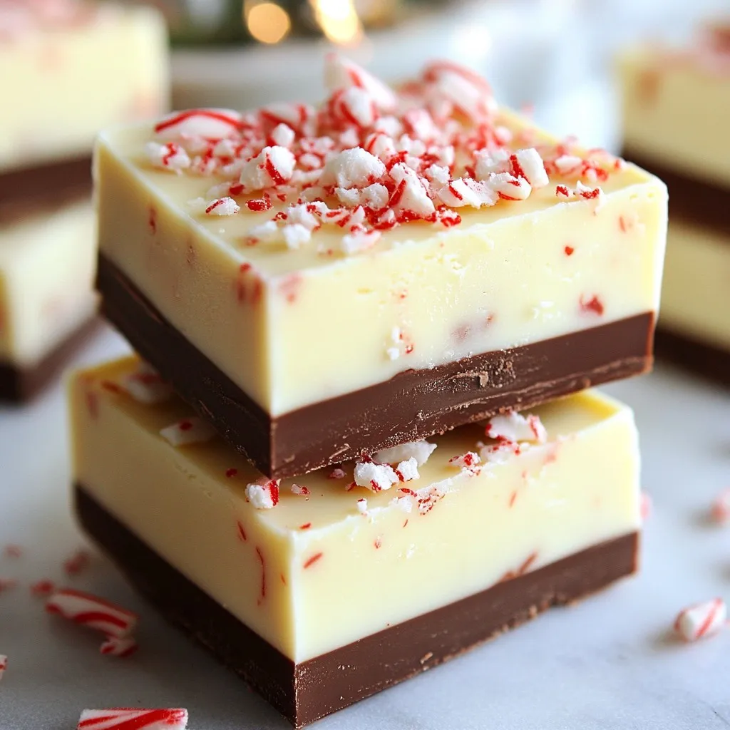 A festive and creamy fudge with layers of semi-sweet and white chocolate, topped with crushed peppermint candies.