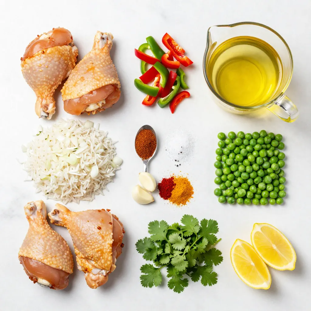 To make this dish, I start with chicken thighs. They add rich flavor and stay juicy. I choose jasmine rice for its delicate taste and unique aroma. Onions and garlic bring a strong base flavor. Bell peppers add color and sweetness.