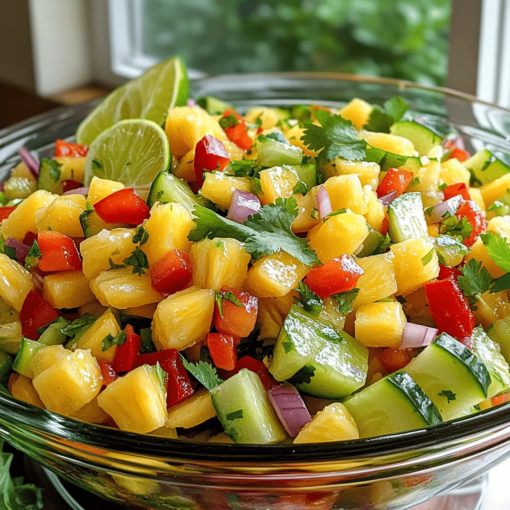 Start by gathering your ingredients. You need one ripe pineapple, one large cucumber, one red bell pepper, and one small red onion. If you want a kick, grab one jalapeño too. Chop them all into small pieces. Dicing them helps mix the flavors well. Don’t forget to finely chop 1/4 cup of fresh cilantro. This adds a bright taste. Squeeze the juice of two limes into a small bowl. Add one tablespoon of honey for sweetness. If you prefer a vegan option, use maple syrup instead. Use salt and pepper to season later.