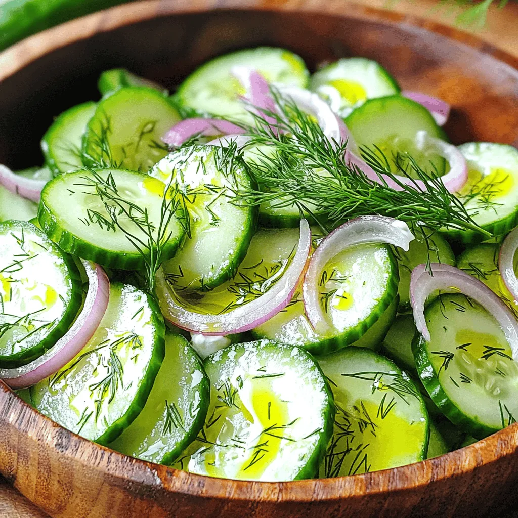 - 4 medium cucumbers, thinly sliced - 1 small red onion, thinly sliced - 1 cup sour cream - 2 tablespoons apple cider vinegar The main ingredients bring a fresh taste to the salad. Choosing the right cucumbers is key. I love using thin-skinned varieties like English cucumbers. They are crisp and juicy. The red onion adds a nice color and a mild bite. Sour cream gives the salad its rich, creamy texture. Apple cider vinegar adds a tangy kick. This balance of flavors makes every bite enjoyable. - 2 tablespoons fresh dill, chopped - 1 tablespoon olive oil - 1 tablespoon sugar - Salt and pepper to taste You can customize your Polish cucumber salad with these extras. Fresh dill adds a fragrant note that works well. Olive oil gives it a richer taste. A little sugar can balance the vinegar’s tanginess. Salt and pepper enhance all the flavors. These optional garnishes help create a salad that suits your taste. You can find the full recipe above to help guide you through. Start by washing the cucumbers well. This removes any dirt or pesticides. Cut off both ends of each cucumber. Use a sharp knife or a mandolin to slice them thinly. Thin slices help the salad absorb the dressing better. For this task, a mandolin is great for even slices, but a knife works fine too. In a large bowl, combine the sliced cucumbers and thinly sliced red onions. Mix them gently to spread out the onions. In another bowl, whisk together the sour cream, apple cider vinegar, sugar, olive oil, salt, and pepper. Make sure everything is well blended. This dressing adds a creamy and tangy flavor to the salad. Now, pour the dressing over the cucumbers and onions. Toss everything together gently. You want to coat all the veggies with the dressing. Add the chopped fresh dill and mix again to combine the herbs. Taste the salad and adjust the seasoning if needed. Cover the bowl with plastic wrap and refrigerate it for at least 30 minutes. This resting time helps the flavors meld beautifully. Before serving, stir the salad again for an even mix. Enjoy your Polish cucumber salad! For the full recipe, check the earlier section. For a crunchy salad, pick the right cucumbers. I recommend using English cucumbers. They have fewer seeds and a thinner skin. Persian cucumbers are also great. They stay crisp and have a nice flavor. Look for firm cucumbers without soft spots. Freshness is key to a tasty salad. Balancing the sour cream and vinegar is important. I like to start with equal parts. You can add more vinegar for a tangy kick. If you prefer it creamier, add extra sour cream. Sweetness is also a matter of taste. Start with one tablespoon of sugar. You can add more if you like it sweeter. A pinch of salt and pepper will enhance all the flavors. Serve your Polish cucumber salad in a clear bowl. This lets the bright colors shine. A sprinkle of fresh dill on top adds a nice touch. You can also use cherry tomatoes for a pop of color. If you want, serve it with crusty bread. This makes for a great side dish at any meal. Enjoy your delicious creation! {{image_2}} Polish cucumber salad is fun to change. You can add different herbs to make it special. Try using parsley or chives for a fresh taste. Each herb gives a unique flavor. Including additional vegetables can also enhance your salad. You might add radishes or bell peppers. These colors and textures make the dish more exciting. You can even mix in tomatoes for a juicy bite. Making this salad vegan-friendly is easy. Swap sour cream with a plant-based option. You can use soy yogurt or cashew cream. Both give a creamy texture without dairy. If you want low-calorie options, cut the sour cream in half. Use Greek yogurt instead. This keeps the taste while making it lighter. You can also skip the sugar or use a sugar substitute. This keeps your salad fresh and flavorful without extra calories. For the full recipe, check out the Polish Cucumber Salad Delight 🥒. To keep your Polish cucumber salad fresh, use airtight containers. This keeps air out and helps prevent spoilage. Store the salad in the fridge right after making it. The cool temperature keeps the flavors bright and the cucumbers crisp. Polish cucumber salad stays fresh for about three days in the fridge. After that, the cucumbers may get soggy and lose their crunch. Check for any off smells or changes in color before eating. If it looks or smells bad, it’s best to toss it. I do not recommend freezing Polish cucumber salad. Freezing changes the texture of the cucumbers. They become mushy once thawed, and the salad will not taste as good. Enjoy it fresh for the best flavor experience. For the full recipe, check out the complete guide. Polish cucumber salad has deep roots in Polish culture. It is a staple dish that many families enjoy. This salad is often served at gatherings and holiday meals. It reflects the importance of fresh, local ingredients. Cucumber salad pairs well with many traditional Polish dishes. It showcases how simple ingredients can create a great flavor. The dish is a great way to celebrate the season's fresh produce. Yes, you can prepare Polish cucumber salad in advance. I recommend making it at least 30 minutes before serving. This allows the flavors to mix well. If you want to prepare it earlier, refrigerate it for a few hours. Just remember to stir it before serving. This salad is best enjoyed chilled. It can stay fresh for up to two days in the fridge. To make your salad creamier, you can adjust the dressing. Adding more sour cream will give it a thicker texture. You can also use Greek yogurt as a tasty alternative. Mixing in a bit of mayonnaise can create a rich flavor. For a lighter version, try using low-fat sour cream. Experiment with these options to find your perfect creaminess level. Enjoy the journey of creating your ideal Polish cucumber salad! You now know how to make a delicious Polish cucumber salad. We covered key ingredients, from crunchy cucumbers and tangy sour cream to optional herbs and seasoni