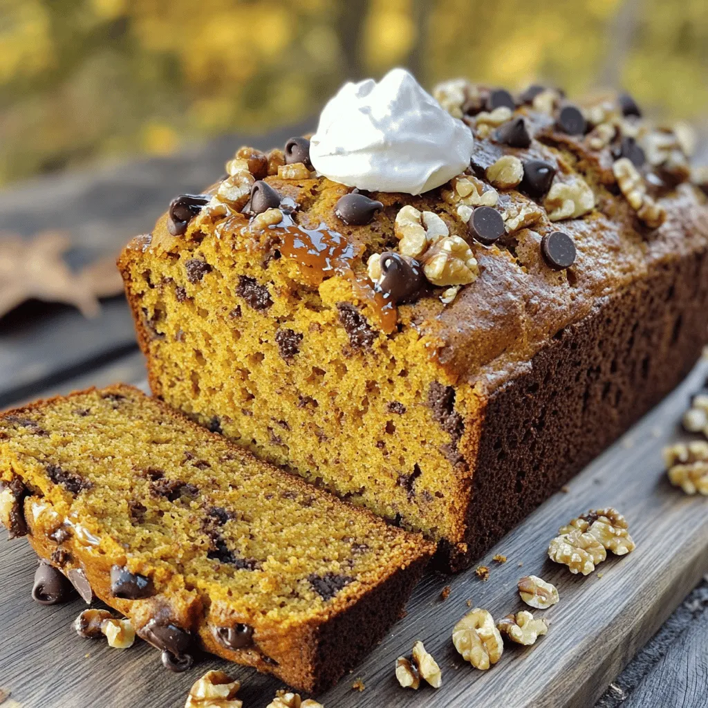 - 1 cup pumpkin puree - 1/2 cup granulated sugar - 1/2 cup brown sugar, packed - 1/2 cup vegetable oil - 2 large eggs - 1 teaspoon vanilla extract - 2 cups all-purpose flour - 1 teaspoon baking powder - 1/2 teaspoon baking soda - 1/2 teaspoon salt - 1 teaspoon ground cinnamon - 1/2 teaspoon ground nutmeg - 1/4 teaspoon ground ginger - 1/4 teaspoon ground cloves - 1/2 cup chopped walnuts or pecans (optional) - 1/2 cup chocolate chips (optional) To make pumpkin pie bread, you need simple ingredients. Start with good pumpkin puree. It gives flavor and moisture to the bread. Then, use both granulated and brown sugars. This mix makes the bread sweet and rich. Next, grab vegetable oil for a soft texture. The oil keeps the bread moist. Don’t forget the eggs; they help bind everything together. Vanilla extract adds a lovely aroma and taste. For the dry mix, you’ll need all-purpose flour. This flour gives the bread structure. Baking powder and baking soda are key for rising. Salt enhances all the flavors, while spices like cinnamon, nutmeg, ginger, and cloves bring warmth and depth. You can add nuts like walnuts or pecans for crunch. Chocolate chips also work well for a sweet touch. Both options add fun to your bread. With these ingredients, you will create a delightful pumpkin pie bread. Each bite will be tasty and satisfying. First, set your oven to 350°F (175°C). This is the best heat for baking. Next, take a 9x5 inch loaf pan. You can grease it well or line it with parchment paper. This makes it easier to remove the bread later. Grab a large mixing bowl. In it, combine 1 cup of pumpkin puree, 1/2 cup of granulated sugar, and 1/2 cup of brown sugar. Add 1/2 cup of vegetable oil, 2 large eggs, and 1 teaspoon of vanilla extract. Use a whisk to mix until everything is smooth. Take another bowl and sift together the dry ingredients. You need 2 cups of all-purpose flour, 1 teaspoon of baking powder, 1/2 teaspoon of baking soda, and 1/2 teaspoon of salt. Then add 1 teaspoon of ground cinnamon, 1/2 teaspoon of ground nutmeg, 1/4 teaspoon of ground ginger, and 1/4 teaspoon of ground cloves. This mix gives your bread great flavor. Now, slowly add the dry mix into the wet mix. Use a spatula to stir. Do this gently until just combined. Be careful not to overmix; this keeps your bread soft and tender. Fold in 1/2 cup of chopped walnuts or pecans and 1/2 cup of chocolate chips if you want. Then pour the batter into your prepared pan. Smooth the top with a spatula. Bake for 55 to 65 minutes. Check doneness by inserting a toothpick in the center. It should come out clean. Once baked, let the bread cool in the pan for about 10 minutes. After that, transfer it to a wire rack. Let it cool completely before you slice. This cooling step is key for the best texture. To get the right texture, use pure pumpkin puree. Avoid pumpkin pie filling, as it has extra spices and sugar. Mix the wet ingredients well until smooth. This helps everything blend nicely. When adding dry ingredients, stir gently. Overmixing can make your bread tough. Keep a light hand for a soft, tender loaf. Check your bread at 55 minutes. Insert a toothpick into the middle. If it comes out clean, your bread is ready. If it has batter on it, bake for another 5-10 minutes. Make sure to let it cool in the pan for 10 minutes. This helps it set and makes it easier to remove. Use a 9x5 inch loaf pan for best results. A non-stick pan or parchment paper makes removal easy. Have measuring cups and spoons handy. A whisk will help mix wet ingredients well. Use a spatula to fold in nuts or chips gently. Slice the bread evenly for nice servings. Arrange the slices on a wooden board for a rustic look. Add a dollop of whipped cream on the side. A drizzle of maple syrup adds a sweet touch. This makes your bread look more appealing. Want to boost flavors? Add chocolate chips or nuts for crunch. You can also mix in dried fruit like raisins. For a spice kick, try adding a bit more cinnamon or nutmeg. This makes every bite exciting and full of flavor. {{image_2}} To make gluten-free pumpkin pie bread, swap out all-purpose flour for a gluten-free blend. Look for a blend that contains xanthan gum. This helps give the bread a nice texture. Use the same amount of gluten-free flour as regular flour. To make this bread dairy-free, replace the vegetable oil with melted coconut oil. You can also use almond or soy milk instead of eggs. This keeps the bread moist and tasty while being dairy-free. Add fun ingredients to make your bread unique. Try mixing in dried cranberries, raisins, or even apple chunks. You can also sprinkle in some pumpkin seeds for a crunchy texture. These add-ins bring out seasonal flavors and make each bite special. For mini loaves or muffins, adjust your baking time. Fill mini loaf pans or muffin tins with batter. Bake mini loaves for 25-30 minutes and muffins for 18-20 minutes. These are perfect for sharing or gift-giving. To create a swirl or marble effect, divide the batter in half. Mix in some cocoa powder or nut butter in one half. Layer the two batters in your loaf pan. Use a knife to swirl them together gently. This adds a fun twist to the classic recipe! Store leftover pumpkin pie bread in an airtight container. This keeps it fresh and moist. It can last about 3 to 5 days at room temperature. For longer storage, place it in the fridge. This can extend its shelf life for up to a week. If you want to keep it even longer, freezing is your best option. To freeze your pumpkin pie bread, first let it cool completely. Once cooled, wrap it tightly in plastic wrap. Then, place it in a freezer-safe bag or container. This helps prevent freezer burn. It can last up to 3 months in the freezer. When you're ready to enjoy it, just thaw it in the fridge overnight. To reheat your pumpkin pie bread, slice it first. Place the slices in the microwave for about 15 to 20 seconds. You can also use an oven. Preheat it to 350°F (175°C) and bake the slices for abo