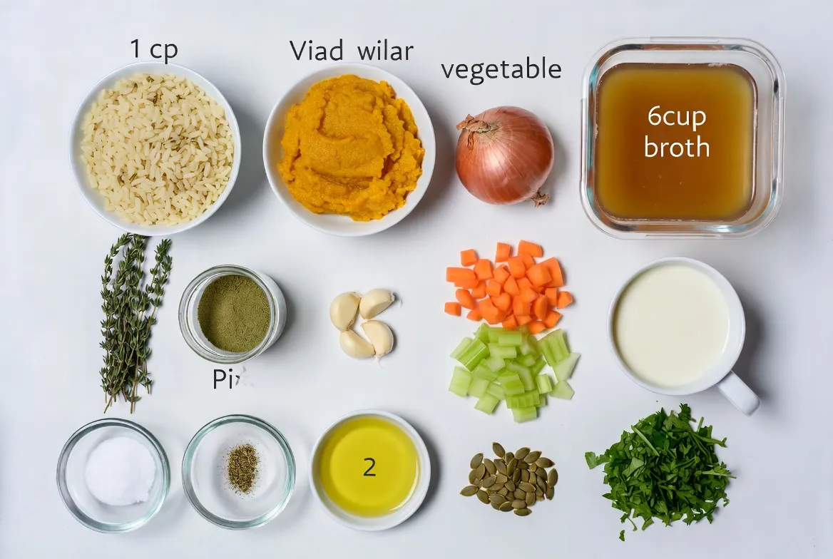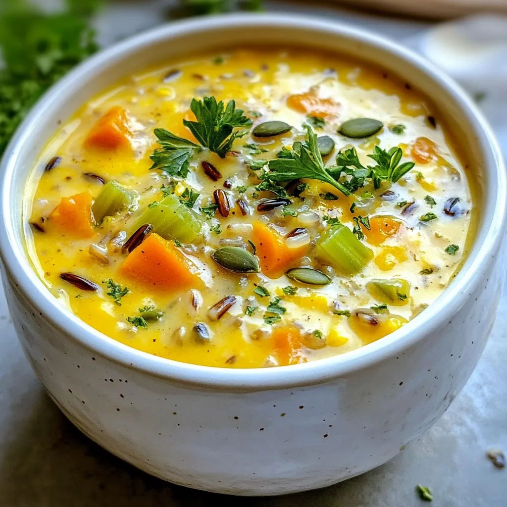 - 1 cup wild rice, rinsed - 2 cups pumpkin puree (canned or fresh) - 1 medium onion, diced - 2 garlic cloves, minced - 3 carrots, diced - 2 celery stalks, diced - 6 cups vegetable broth - 1 cup coconut milk - 1 teaspoon ground sage - 1 teaspoon thyme - Salt and pepper to taste - 2 tablespoons olive oil - Fresh parsley, chopped for garnish - Pumpkin seeds for garnish (optional) In this Pumpkin Wild Rice Soup, each ingredient plays a key role. The wild rice offers a nutty taste and chewy texture. Pumpkin puree adds creaminess and a subtle sweetness. Diced onion and garlic bring a strong base flavor. Carrots and celery give a fresh crunch and balance the dish. I love using coconut milk for creaminess. It gives the soup a nice tropical twist. Ground sage and thyme add warmth and depth. Adjust the salt and pepper to fit your taste. Don't forget the garnishes! Fresh parsley adds color and brightness. Pumpkin seeds give a nice crunch when sprinkled on top. Each ingredient makes this soup comforting and delicious. {{ingredient_image_1}} 1. First, heat olive oil in a large pot over medium heat. 2. Add diced onion, minced garlic, diced carrots, and diced celery. 3. Sauté these veggies for 5 to 7 minutes. You want them soft, and the onion should look clear. 4. Next, stir in the ground sage and thyme. Cook for one more minute. This helps the spices release their great smell. 5. Now, add the rinsed wild rice to the pot. Pour in the vegetable broth too. 6. Bring the mix to a boil. Then, reduce the heat to a simmer. 7. Cover the pot and let the soup cook for 30 to 40 minutes. The rice should be soft when done. 1. Once the wild rice is tender, stir in the pumpkin puree. 2. Then, add in the coconut milk and mix well. 3. Let the soup simmer for another 10 minutes. This helps all the flavors blend together. 4. Taste the soup. Add salt and pepper as needed to bring out the flavors. 1. Serve the soup hot. 2. Garnish with chopped fresh parsley for a pop of color. 3. You can add pumpkin seeds on top for some crunch. 4. Pair the soup with crusty bread or a side salad for a complete meal. Achieving the perfect rice texture To get wild rice just right, rinse it well before cooking. This step removes excess starch and helps the rice cook evenly. When you add it to the pot, make sure to use enough broth. The rice needs liquid to cook fully. Keep an eye on it while it simmers. You want the rice to be tender but not mushy. About 30 to 40 minutes usually does the trick. Flavor enhancement suggestions To boost the flavor, use fresh herbs instead of dried ones. Fresh thyme or sage adds a bright taste. You can also add a splash of lemon juice at the end. This gives the soup a nice zing. If you want more spice, try adding a pinch of cayenne pepper or red pepper flakes. This adds warmth without overwhelming the dish. Alternative vegetables If you want to swap out some veggies, go for it! Sweet potatoes or butternut squash work well. You can also use leeks instead of onions for a milder flavor. Don't be afraid to mix in leftover veggies you have at home. Just remember to keep your flavors balanced. Dairy-free options For a creamier texture without dairy, stick with coconut milk. It adds creaminess and a hint of sweetness. If you prefer almond or oat milk, those can work too, but the soup may be less rich. Always check the labels to ensure they fit your dietary needs. Pro Tips Choose the Right Rice: Wild rice adds a nutty flavor and chewy texture, but you can substitute with brown rice if you prefer. Just adjust the cooking time accordingly. Fresh Herbs for Flavor: Using fresh herbs like sage and thyme can enhance the soup's flavor profile significantly compared to dried herbs. Adjust Creaminess: If you prefer a creamier soup, feel free to add more coconut milk or even a splash of heavy cream for richness. Garnish for Appeal: Top your soup with additional garnishes like a drizzle of olive oil or a sprinkle of nutritional yeast for an extra layer of flavor and visual appeal. {{image_2}} You can make your Pumpkin Wild Rice Soup even heartier by adding protein. Beans and lentils work great. They add texture and flavor. Just stir in one can of black beans or a cup of cooked lentils during the last 10 minutes of cooking. This change gives your soup a boost of protein. If you prefer meat, cooked chicken or sausage is a tasty option. Simply shred some cooked chicken or slice up cooked sausage and add it to your pot. This step not only adds protein but also enhances the flavor. The meat absorbs the rich broth and spices, making each bite more satisfying. Using fresh pumpkin can take your soup to the next level. Fresh pumpkin has a bright flavor that canned puree may lack. To prepare fresh pumpkin, cut it into chunks, roast it until tender, and then blend it to a smooth puree. This extra step makes your soup taste even fresher and more vibrant. You can also think about using seasonal herbs. Fresh thyme or sage adds a lovely touch. Just chop some and stir it in right before serving. This way, you highlight the natural taste of your soup while adding a burst of freshness. These small changes can make a big difference in flavor and enjoyment. To keep your Pumpkin Wild Rice Soup fresh, start by storing leftovers properly. First, let the soup cool down to room temperature. Then, pour it into an airtight container. This helps keep the soup's rich flavor. You can refrigerate the soup for up to five days. If you want to save it for later use, freezing is a great option. Use freezer-safe containers or bags. Make sure to leave some space at the top for expansion. The soup can last in the freezer for up to three months. When you're ready to enjoy the soup again, reheating properly is key. The best method is to use a pot on the stove. Pour the soup into the pot and heat over low to medium heat. Stir it often to keep it from sticking. This method warms the soup evenly. You can also use a microwave if you’re in a hurry. Place the soup in a micr