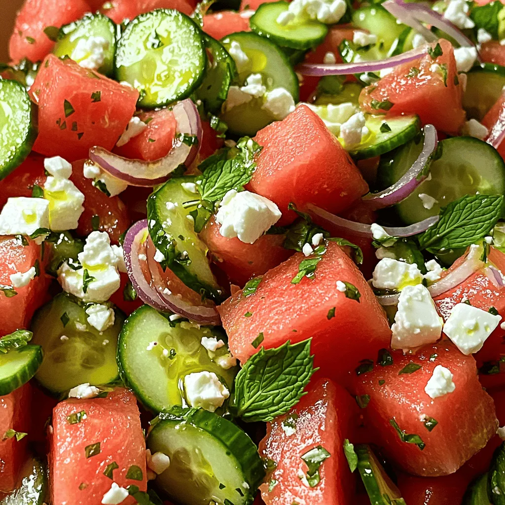 Each ingredient adds a special touch. The watermelon gives sweetness. The cucumber adds crunch. Feta brings saltiness. Fresh mint gives it a nice herbal note. Red onion adds a bit of bite. Olive oil and lime juice create a tasty dressing. Salt and pepper enhance all the flavors.