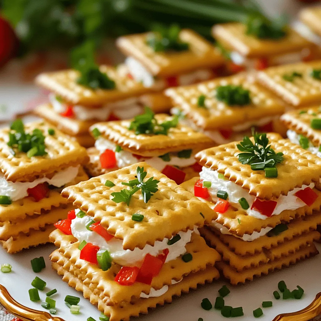 - RITZ Crackers - Cream cheese and its variations For these sandwiches, you need a box of RITZ crackers. They give a nice crunch. You will also need 8 ounces of cream cheese. Softened cream cheese blends well with other flavors. You can use plain cream cheese or try flavored ones. - Diced red bell pepper - Green onions - Deli meats like turkey or ham Next, add some diced red bell pepper. This gives a sweet taste and bright color. Chopped green onions add a fresh bite. If you like, slice some deli turkey or ham for extra protein. These meats make your sandwiches heartier and more filling. - Garlic powder - Cayenne pepper - Garnishes like parsley or chives For extra flavor, you can add garlic powder. Just half a teaspoon works well. If you want a little heat, use a pinch of cayenne pepper. It's optional but worth a try. Finally, consider garnishing your sandwiches with fresh parsley or chives. They add a lovely touch and make the dish more appealing. First, gather your ingredients. In a medium bowl, combine 8 oz of softened cream cheese, 1/2 cup of diced red bell pepper, 1/4 cup of chopped green onions, 1/2 tsp of garlic powder, and a pinch of cayenne pepper if you like some heat. Mix them well until the cream cheese is smooth and all the bits are blended in. Next, take a RITZ cracker and spread about a tablespoon of your creamy mixture on top. Make sure to cover the cracker well for the best flavor. If you want, you can add a slice of deli turkey or ham on top of the cream cheese mixture for extra taste. Now, it’s time to make the sandwiches! Place another RITZ cracker on top of the cream cheese mix. Press down gently to hold everything together. Repeat this step until you have used all of the mixture. You will end up with a lovely platter of RITZ cracker sandwiches that are ready to impress. To make your sandwiches look pretty, add a garnish of fresh parsley or chives on top. This adds color and a bit more flavor. For serving, arrange the sandwiches on a nice platter. You can even use a colorful plate to make them stand out at your gathering. Enjoy your delicious RITZ cracker party sandwiches! To get the best taste, start with softened cream cheese. Softened cream cheese blends easily with other ingredients. It helps create a smooth and creamy filling. If the cream cheese is cold, it will be hard to mix. Next, balance flavors with spices and veggies. Diced red bell pepper adds sweetness and crunch. Green onions bring a mild onion flavor. Garlic powder adds depth without being too strong. If you like heat, add a bit of cayenne pepper. It gives the sandwiches a nice kick. Make your sandwiches look great! You can arrange the sandwiches in fun shapes. Try stacking them in a pyramid or a circle. This makes your platter eye-catching. Using colorful garnishes adds more appeal. Fresh parsley or chives not only look nice but also add flavor. Scatter them on top of the sandwiches for a pop of color. If you have a party coming up, prepare the filling in advance. You can make it a few hours before your guests arrive. Just store it in the fridge until you’re ready to assemble. For quick assembly, have your RITZ crackers and filling ready. You can spread the mixture and stack the sandwiches in just a few minutes. This way, you won’t rush when guests arrive. {{image_2}} You can switch up the fillings to suit your taste. For a vegetarian option, try using mashed avocado or hummus. Both add creaminess and flavor. If you want meat, consider chicken salad or roast beef. These options bring different textures and tastes to the table. Want a little heat? Add sliced jalapeños for a spicy kick. This will give your sandwiches a zesty twist. If you like sweet and savory, try using fruit spreads like fig or apple. These spreads complement the cream cheese well and add a fun flavor mix. Make your sandwiches match the season! For holidays, use red and green veggies or festive spreads. This adds a fun touch to your party table. For kids' parties, use fun ingredients like peanut butter and jelly or mini pepperonis. Kids love colorful and playful food! To keep RITZ cracker sandwiches fresh for a day, place them in an airtight container. This helps to keep the crackers crisp and the filling creamy. If you stack them, add parchment paper between layers. This will prevent sticking. For longer storage, you can freeze the sandwiches. Wrap each sandwich tightly in plastic wrap. Then, place them in a freezer bag. This method keeps the flavors intact. Use the sandwiches within three months for the best taste. To refresh stored sandwiches, let them sit out for a few minutes. This helps them regain some texture. If you want them warm, use a microwave. Heat them for about 10-15 seconds. This will warm the filling without making the crackers soggy. Enjoy your tasty bites! Yes, you can make these sandwiches in advance. Just prepare them a few hours before your event. Keep them in a sealed container in the fridge. This helps the flavors mix well. But, don't stack them too high. The crackers might get soggy if they sit too long. For best taste, eat them within 24 hours. There are many fun ways to change up these sandwiches! Here are some ideas: - Use different cheeses, like cheddar or goat cheese. - Add veggies like cucumbers or olives for crunch. - Swap turkey or ham with chicken salad or roast beef. - Try using hummus or avocado for a vegetarian option. - For a sweet twist, add a fruit spread with cream cheese. You can find RITZ crackers in many places. Check your local grocery store in the snack aisle. If you can't find them, try online shopping. Websites like Amazon often have them. You can also visit big-box stores. They usually have a wider selection of snacks. Don't forget to check specialty food stores too. RITZ cracker sandwiches are simple, tasty, and fun. We covered the main ingredients like RITZ crackers and cream cheese, as well as add-ins like meats and veggies. Remember to use fresh garnishes for a special touc