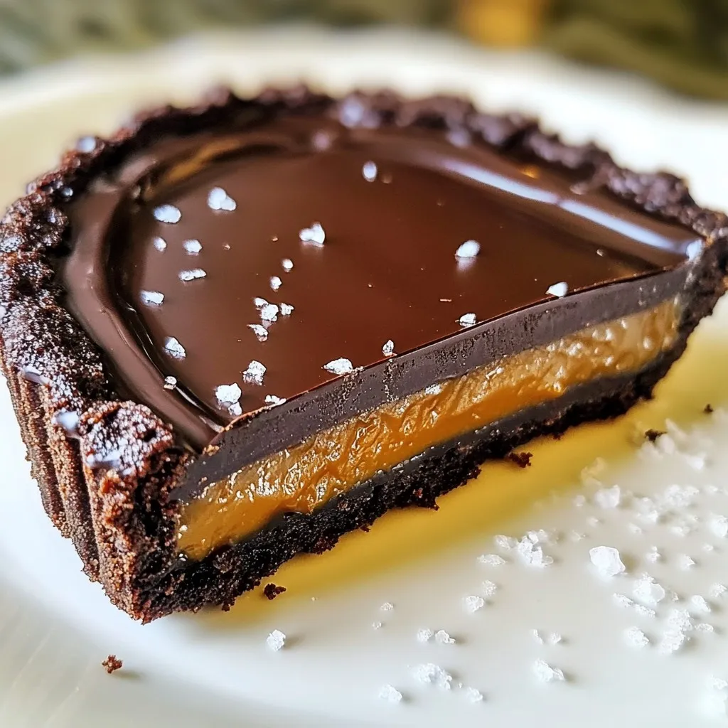 A rich and decadent tart featuring a chocolate crust, salted caramel filling, and a smooth chocolate ganache.