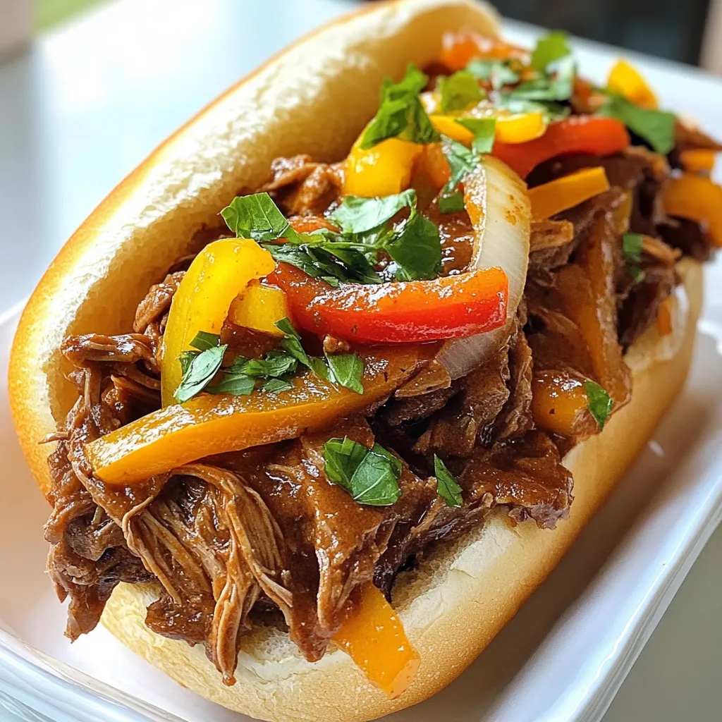 When cooking is done, take the beef out of the slow cooker. Use two forks to shred it. It should fall apart easily. Mix the shredded beef back into the sauce and veggies. This step makes every bite flavorful. Serve your Italian beef on hoagie rolls. Garnish with fresh basil leaves for a nice touch. Enjoy!