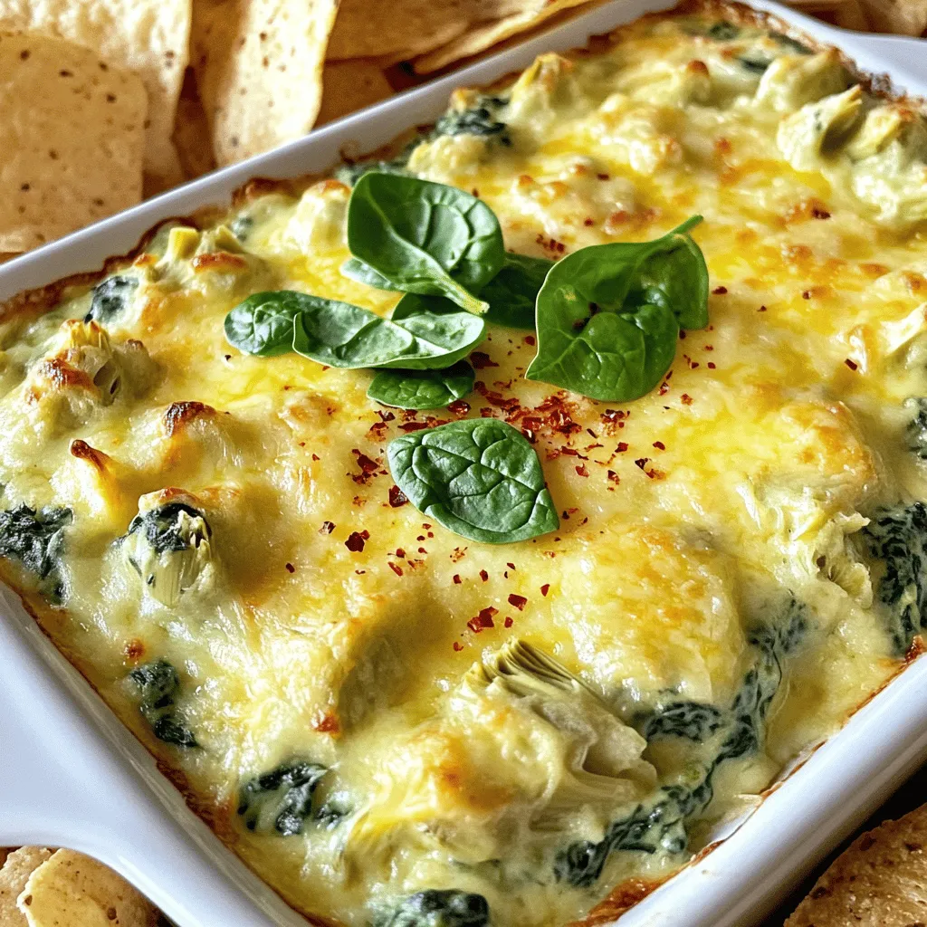 The best way to serve Spinach Artichoke Dip is hot. You can use containers like a small cast-iron skillet or a shallow dish. This makes it easy for guests to dip. Great options for dipping include toasted bread, tortilla chips, or fresh vegetable sticks. You can also garnish with red pepper flakes or fresh spinach for a pop of color.