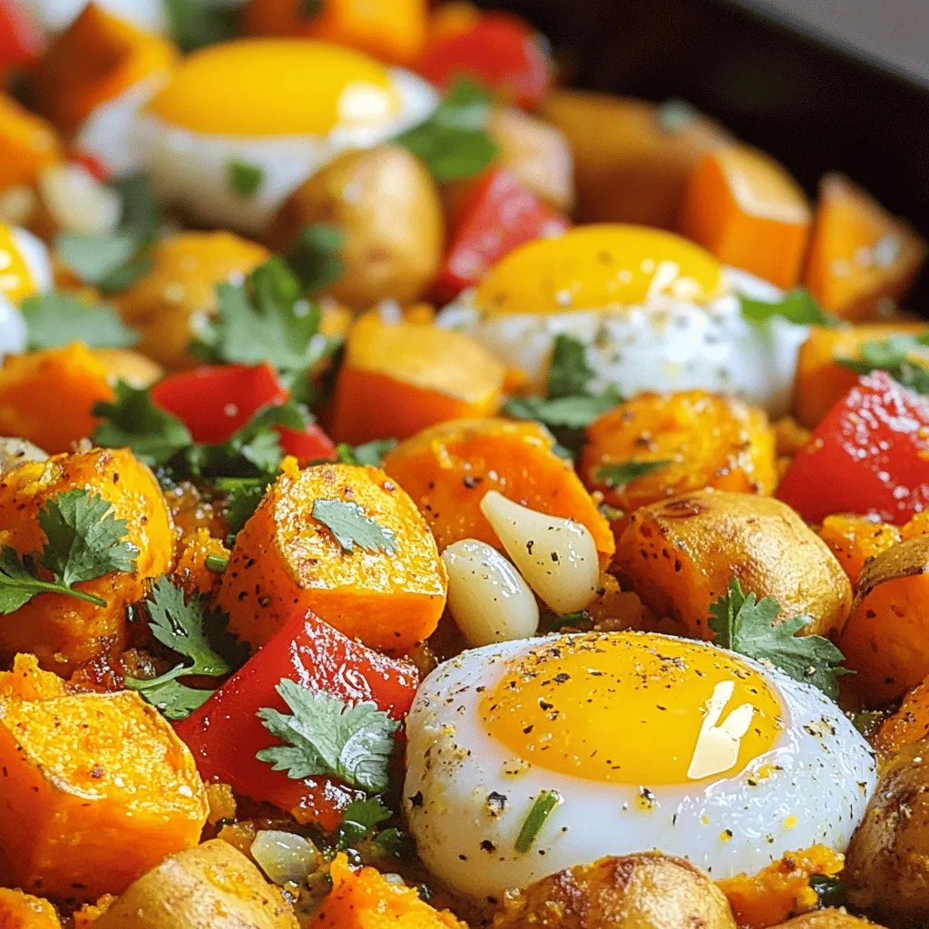 When making savory sweet potato hash with eggs, you need fresh and vibrant ingredients. The sweet potatoes bring natural sweetness and a creamy texture. The red bell pepper adds color and crunch, while the onion provides a sweet base. Garlic gives a nice depth of flavor.