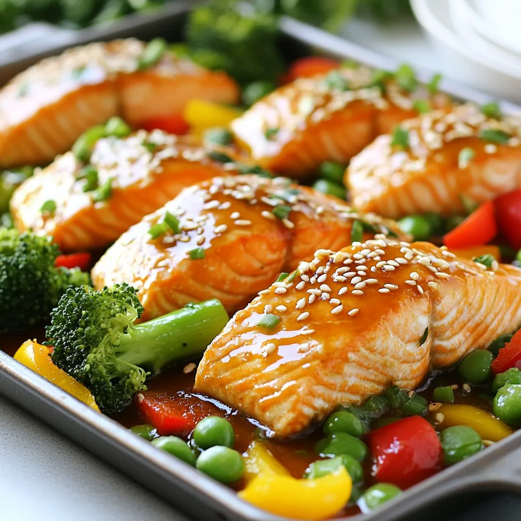 A delicious and easy one-pan meal featuring salmon fillets and a variety of colorful vegetables, all drizzled with a savory teriyaki sauce.